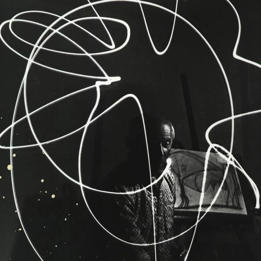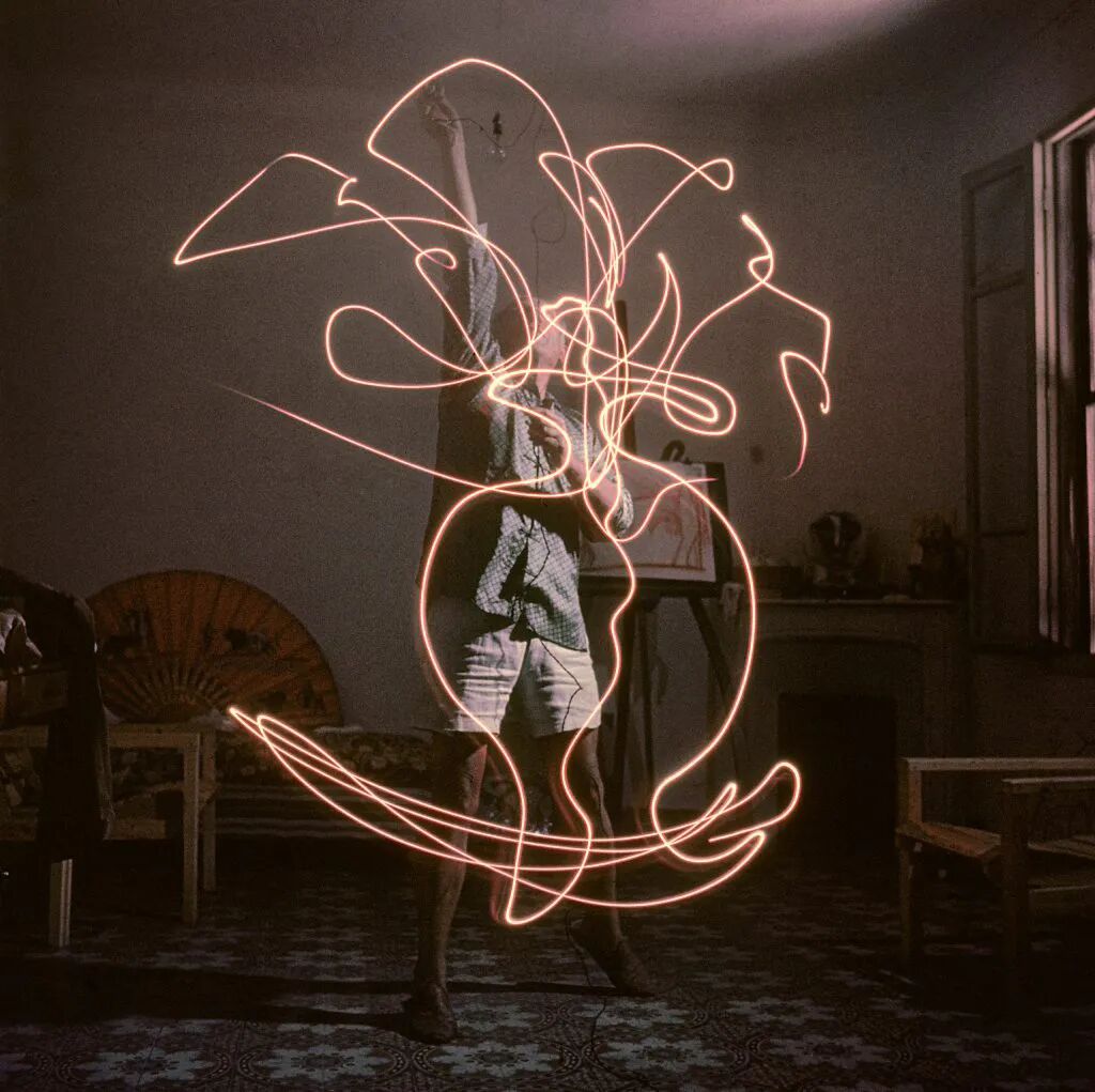 《LIFE》雜誌攝影師Gjon Mili拜訪畢加索,記錄下其用光作畫,1949年