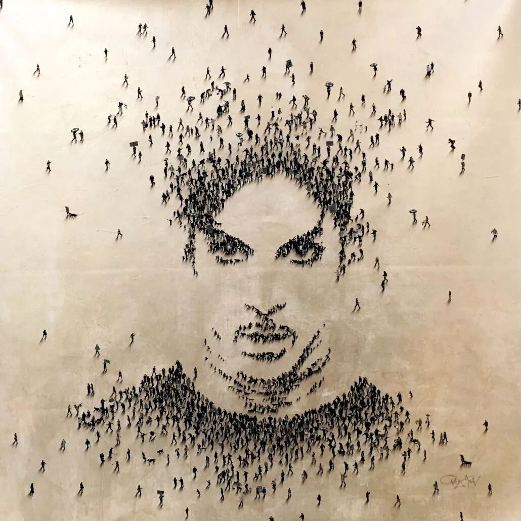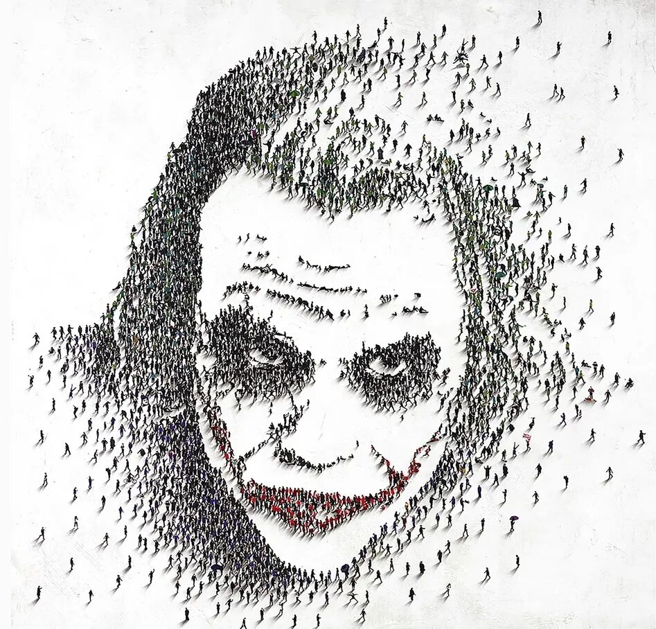 原來人也可以被用來作畫嗎?美國藝術家克萊格·阿蘭(Craig Alan)在一棟大樓向下拍照時,發現樓下的人群似乎呈現出某種圖案,由此受到“以人為畫”的啟發。藝術家利用各種身穿不同顏色的人物拼湊出了希斯·萊傑(Heath Ledger)的經典小丑形象,甚至還原到現實場景,組織人群並完成巨幅名人肖像。