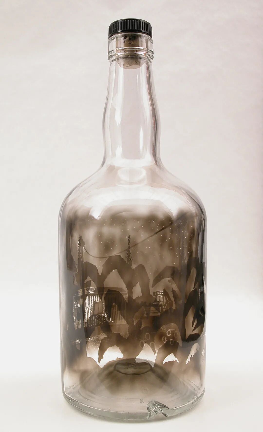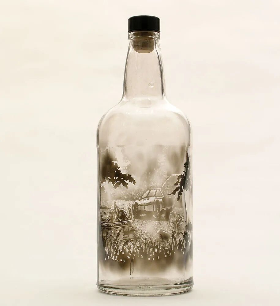 一聽到在煙燻瓶中作畫,你是不是立馬想起鼻菸壺?美國藝術家吉米·丁吉利安(Jim Dingilian)利用燃燒的蠟燭在瓶子中燻出富有層次感的黑色煙霧,然後用細小的鵝毛在瓶中繪製景物。煙燻配上玻璃瓶子使得刻畫物體變得細緻,並且空間感十足。