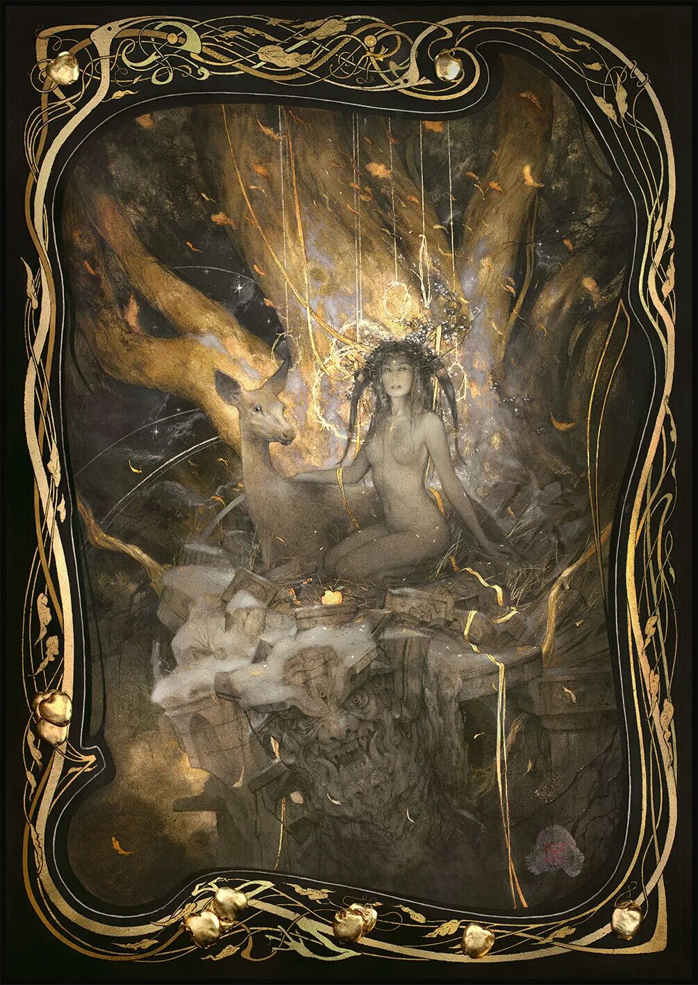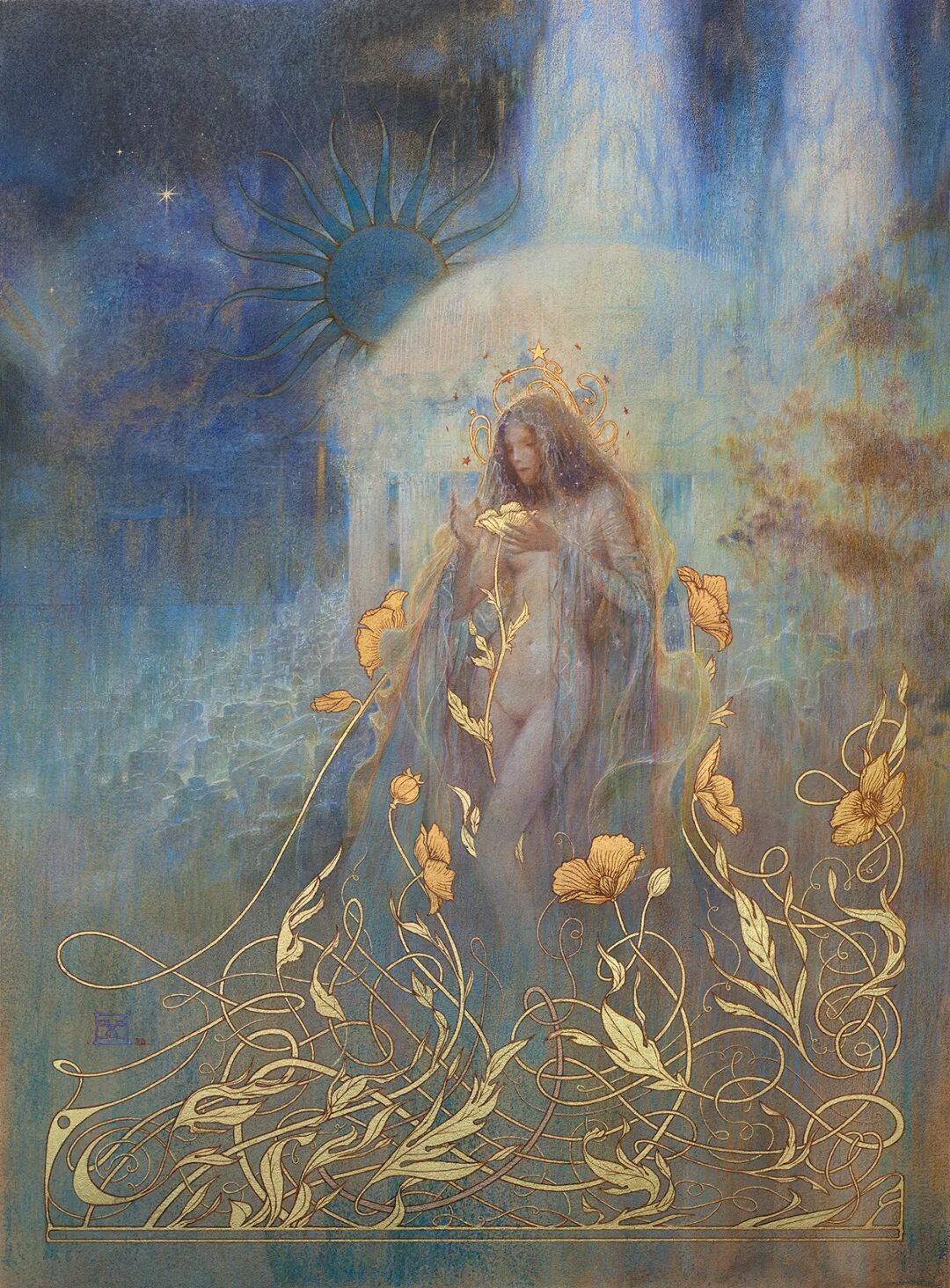 法國傳統藝術家約安·洛塞爾(Yoann LosseI)經常會在其素描作品中加入金箔,他會在紙上畫好素描再貼金,並用刻刀雕刻圖案和紋理,最後再用水彩潤色。不同時段,金箔的反光會對畫面產生不同效果,金箔作畫不僅僅是奢侈,也產生美輪美奐的效果。