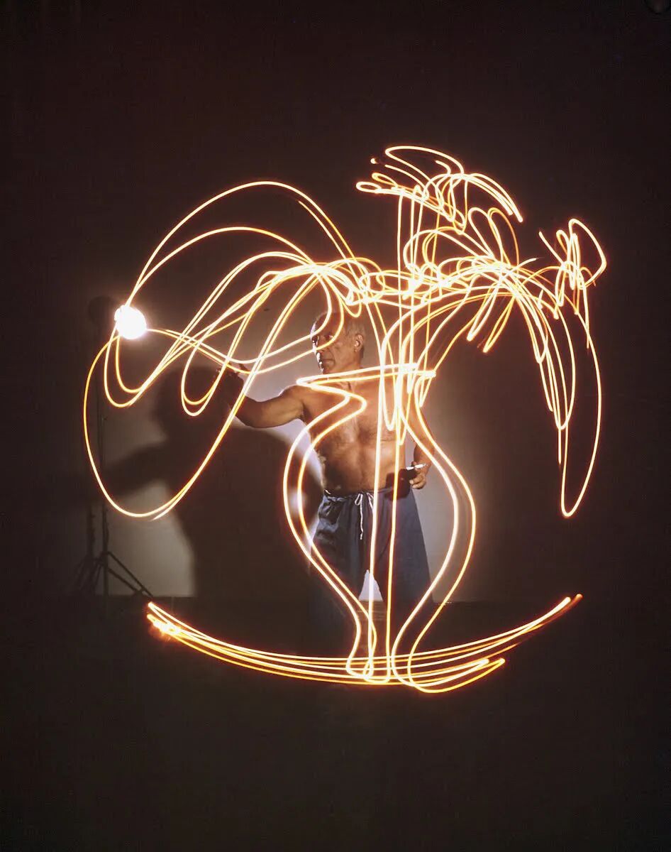 後人經常會用“畢加索永遠是年輕的”來形容他多變的藝術形式。藝術家善於運用各種形式與材料進行藝術創作,作品包括但不限於油畫、素描、版畫、雕塑、陶藝等。1949年,《LIFE》雜誌的攝影師讓畢加索觀看一組光繪畫作品:在黑暗的環境中拍攝光的運行軌跡。於是,畢加索立即被這種攝影形式所吸引,並激發出靈感,想到用這種技術把空氣作為畫布來創作。