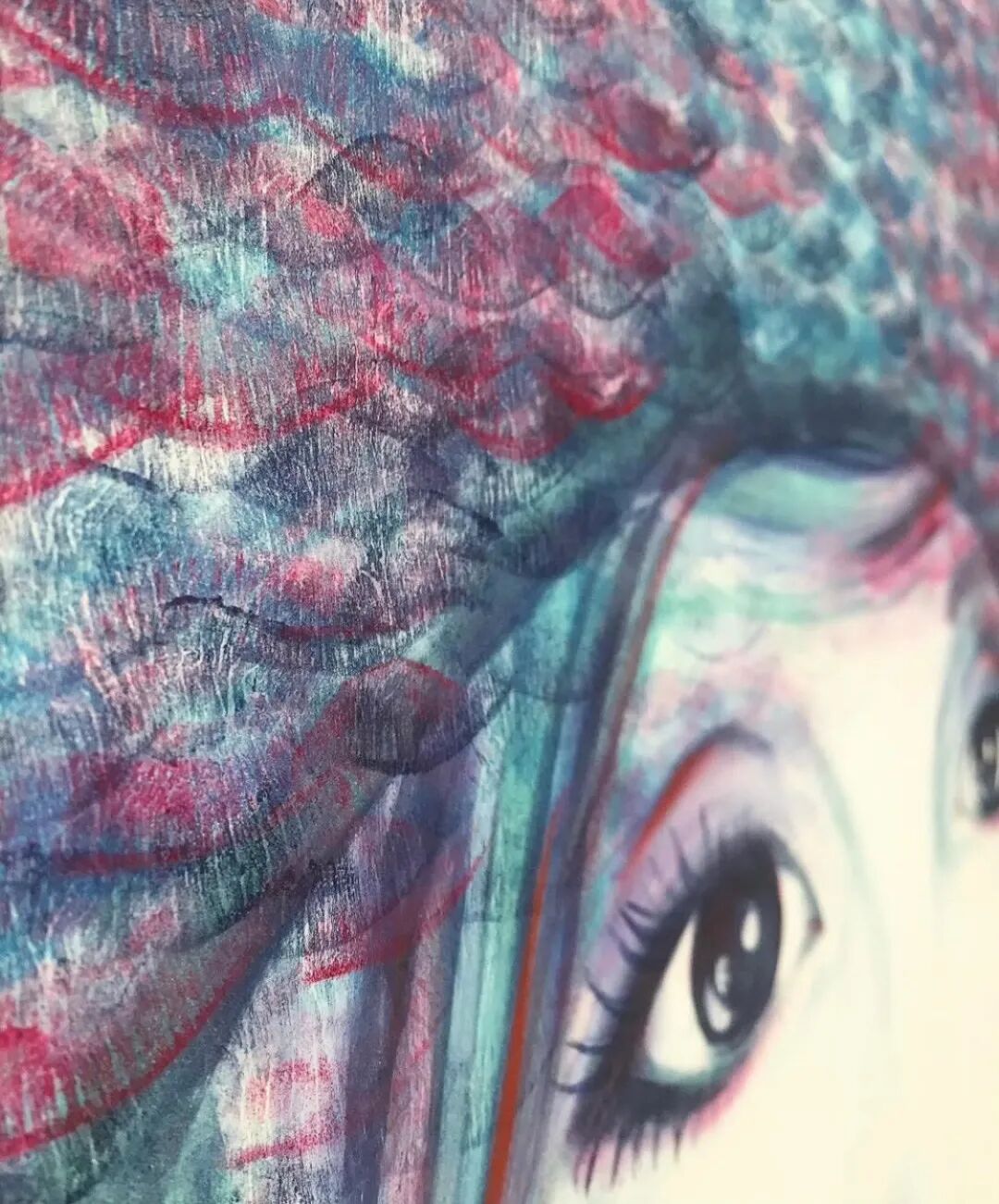 觀者細看能看到嘴唇的紋理以及反覆疊加而成的虛化感