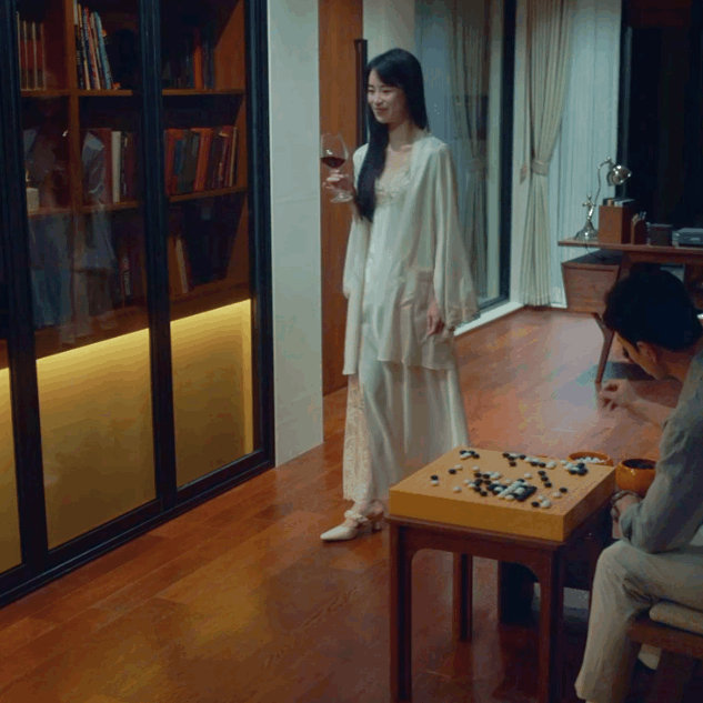 細心的你甚至都可以發現她的居家服都相當美麗、得體,緞面材質的睡裙包裹全身,絲質長袍、蕾絲低領短裙……柔軟的質地更為她渡上了一層柔和的光圈。