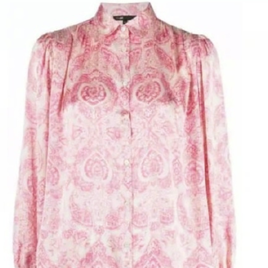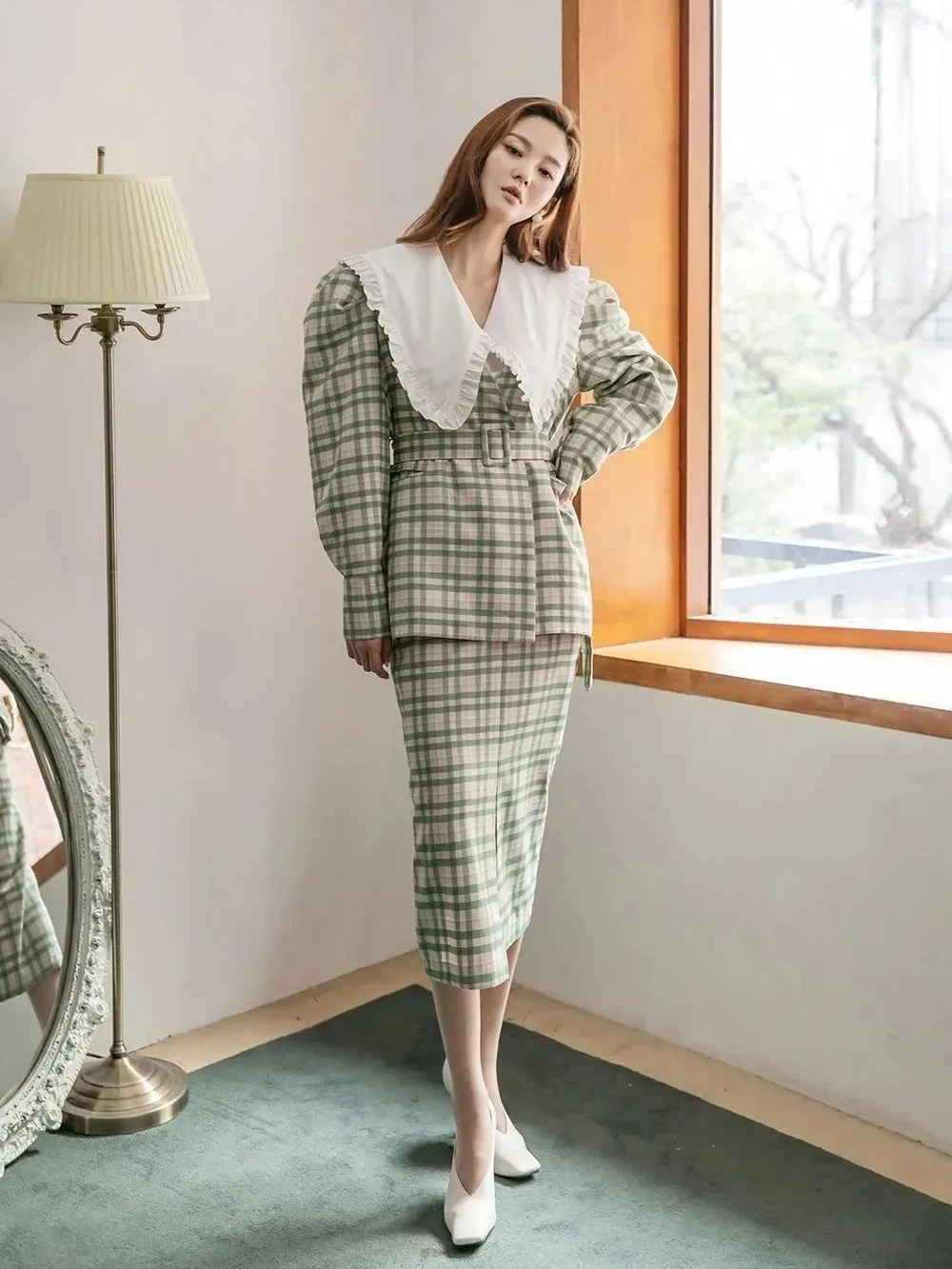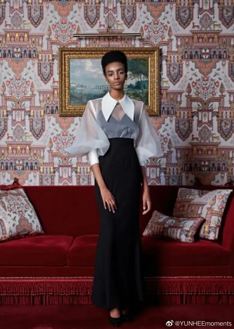 一些帶有小心機設計的襯衫也被妍珍挑選出來。寬一號的肩線被泡泡袖覆蓋,力量感十足;尖尖的領子下方綴上了寶石元素,復古大氣。
