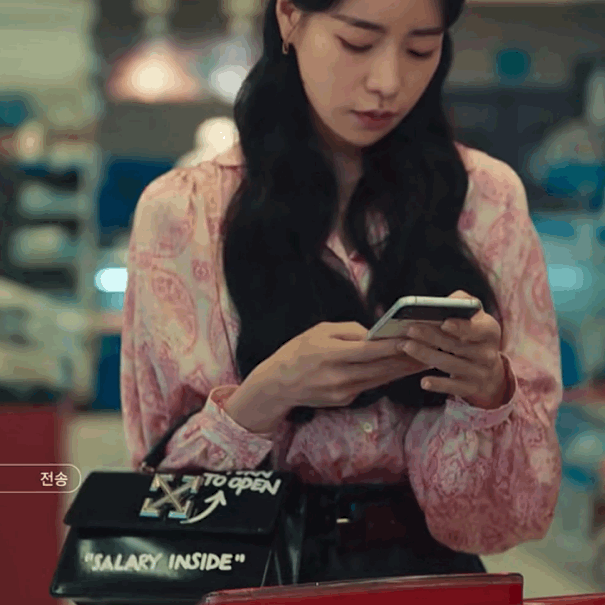 優雅的Chloe Tess系列,她偏好淺淺的裸色;寫著“Salary inside”(裡面有工錢)的Off-White手袋是妍珍打工時的必備單品。