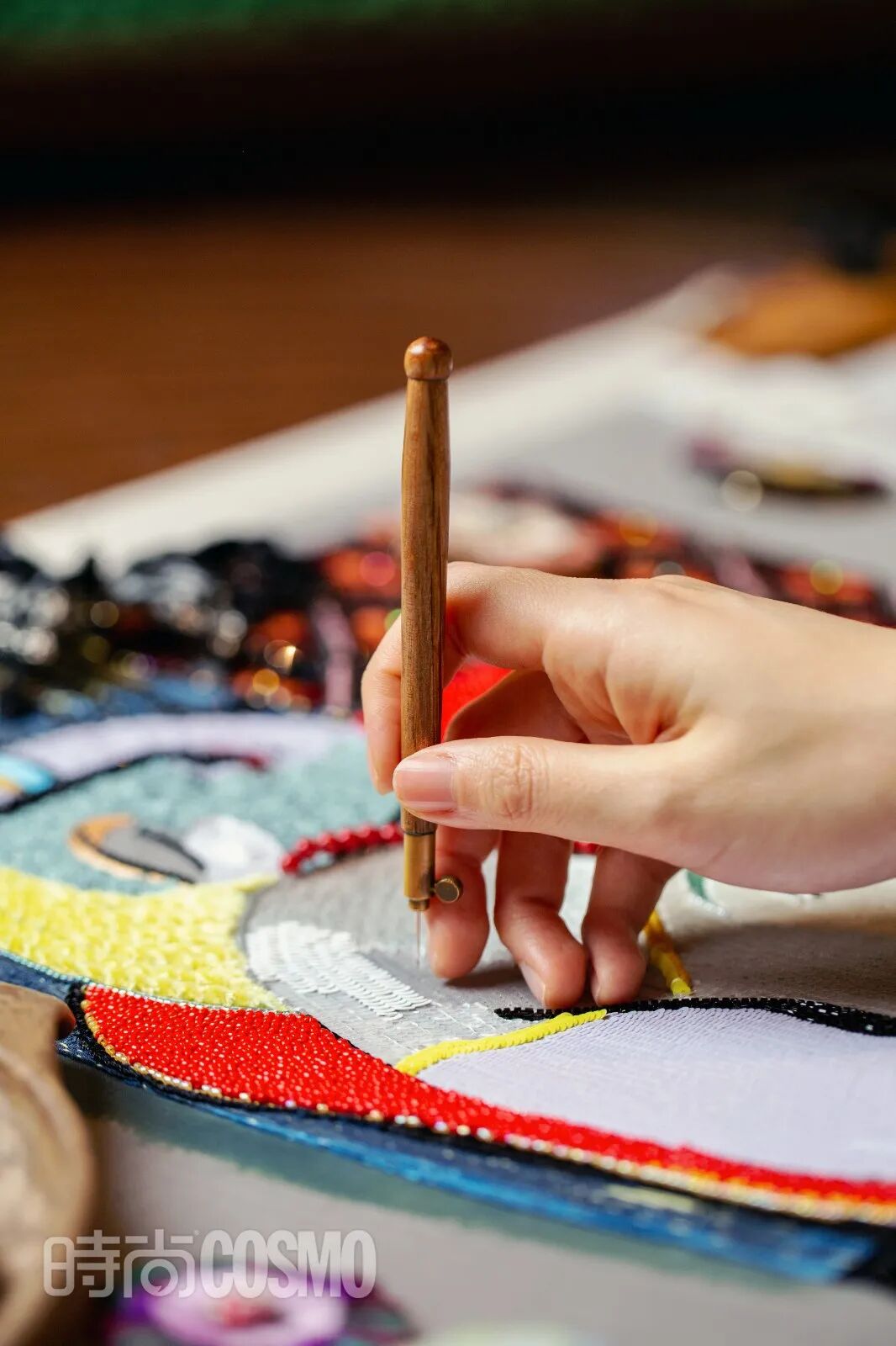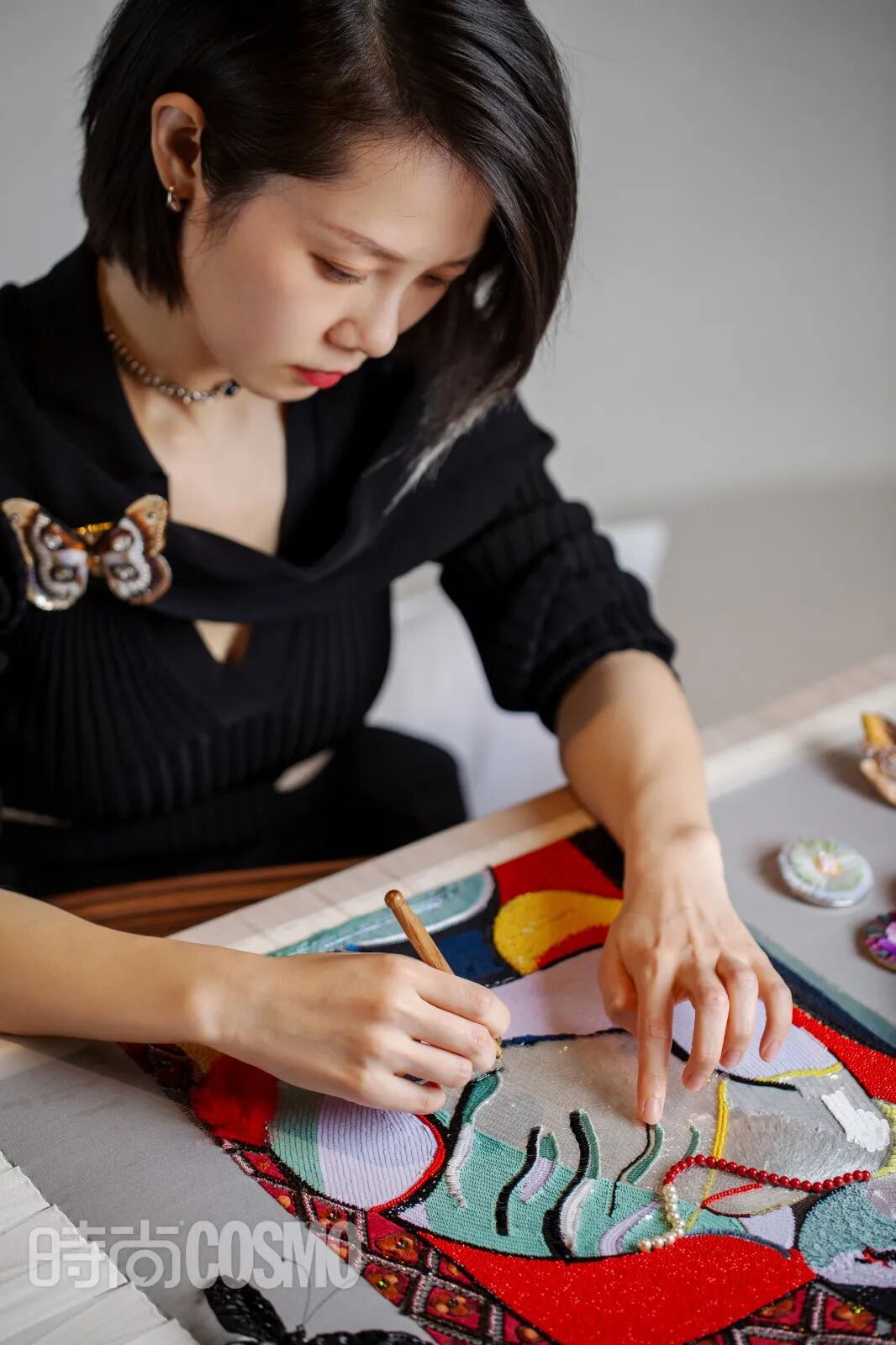 在張曉星的工作室裡,工作臺上總是會放著一本《明清繡法》,從唐代周昉《簪花仕女圖》中吸取靈感創作的《縷薇傳》,以敦煌壁畫為原型繡制的樂高包,即使每個作品的製作時間都是以年計,張曉星與宋亞樵仍在不斷學習法繡的用料和中國刺繡的寫意,將東方與西方的文化無縫銜接成一體。在《縷薇傳》中,她和團隊用傳統的蘇繡技法刻畫出美人臉部細膩的皮膚。比起強調材料不設限與立體效果的法繡,蘇繡則講求用蠶絲線調動高超技藝還原逼真的效果。她又將中國的陶瓷融合其中,用陶瓷燒製出仕女的臉。在表現中國傳統京劇的“小花旦”作品裡,他們通過不同的金線和不同材質的層疊去表現出花旦頭飾的豐富質感,而,歐式刺繡無法表現的花旦臉部,則用蘇繡進行更為細膩的呈現。最近曉星和夥伴正在完成的是一幅畢加索和張大千作品的融合刺繡。她把完成一半的作品帶到了拍攝現場,大家看到大相徑庭的風格流派在一塊輕柔布料上,相得益彰。當東方的材料和手藝與法繡的材料與技法相遇,不同文明之間的碰撞達成了和諧,也為中國刺繡帶來了更多突破的可能性。“蘇州文旅局曾邀請我們跟蘇州非遺傳承人合作,他們嘗試在蘇繡裡做立體效果,創作了很多作品,比如,蝴蝶立體胸針。”這些變化也讓她感受到更大的動力。古老的東方元素也就有了更精妙的表達。