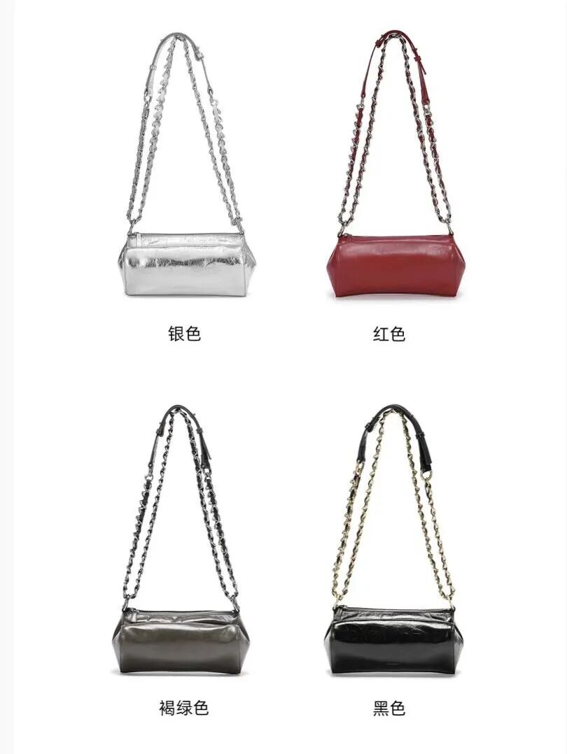 包包用的是油蠟皮材質,紋路自然高級,是用久了反而更有味道的那種,配有一個可拆卸的皮拼長鏈條,可以腋下、手拎、斜挎三背。