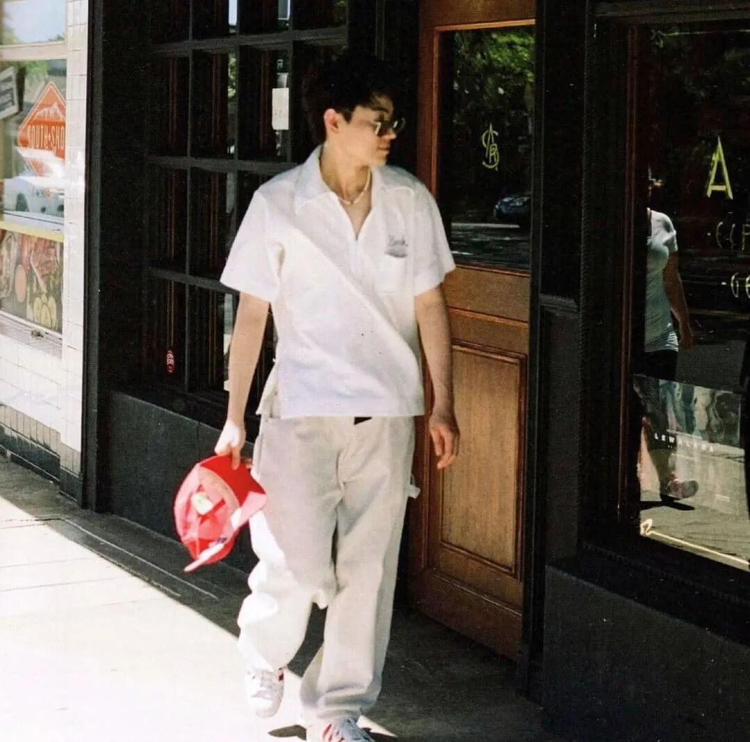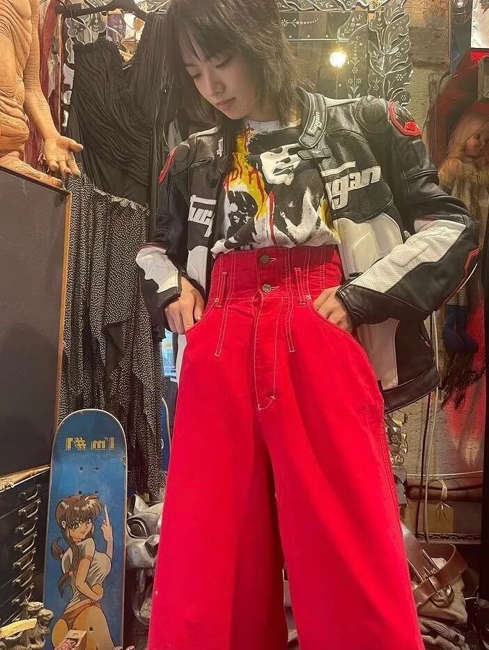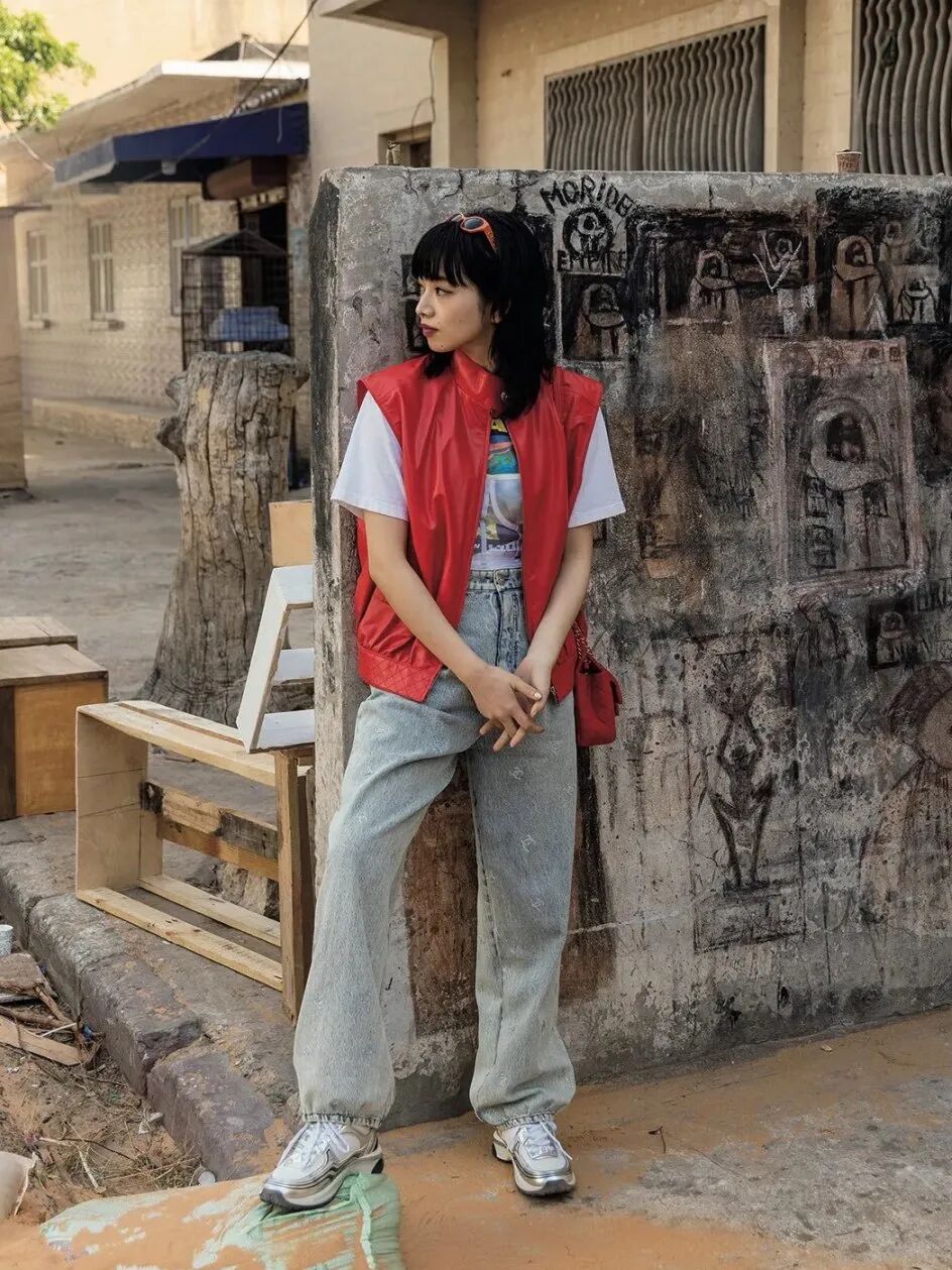 機車夾克搭配高腰復古紅闊腿褲;印染衛衣搭配淺色直筒褲與黃色球鞋;復古紅色夾克搭配白 Tee,有種酷酷的少年感。