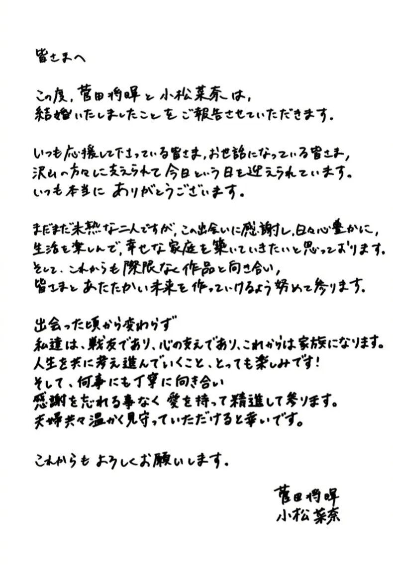 在這裡向大家報告菅田將暉、小松菜奈結婚的消息。非常感謝一路以來支持我們的各位,感謝一直照顧我們的人,正是有大家的支持我們才能迎來今天,真的非常感謝大家。