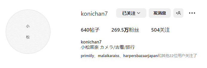 而小松菜奈呢?也是 Vintage 古著的狂熱粉,甚至直接把對 Vintage 古著的熱愛寫在了自己的個人介紹中。