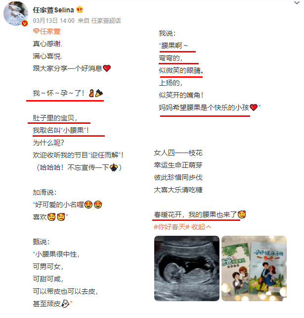 Selina還帶著美好心願給寶寶起了小名叫“小腰果”,希望孩子會甜甜的,笑眯眯的。