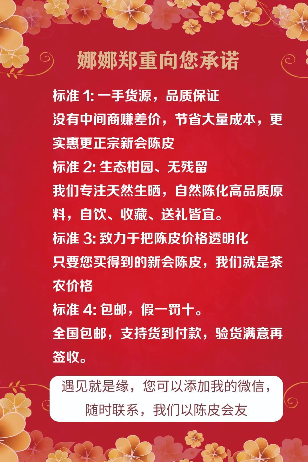 若你我有緣,便是相識交心!我的朋友圈每天都會分享最新的陳皮業內現狀、傳統新會陳皮的製作過程,買不買沒關係,我們可以一起交流品鑑、聊陳皮、存陳皮、以及喝陳皮的心得,也歡迎大家到我們新會來做客, 我們以皮會友。