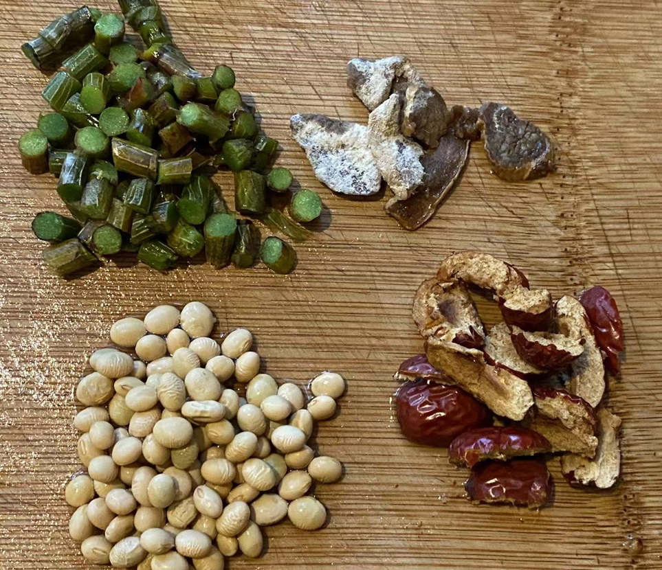我的吃法是:2根鮮條+三四顆紅棗+一二片紅糖薑片(有時用姜粉)+一小把大豆。