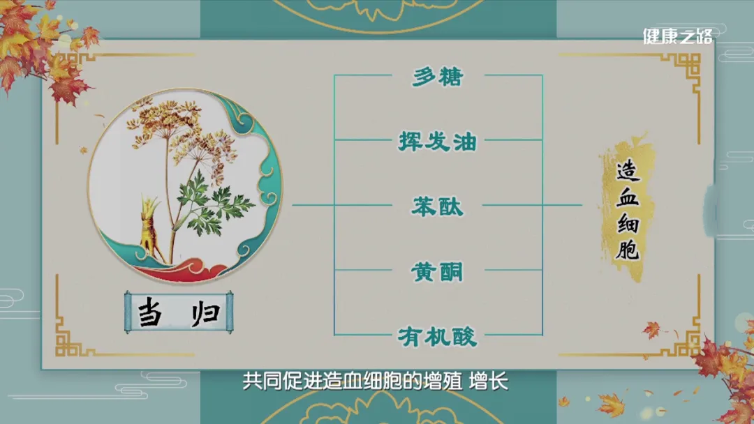 當歸由多糖、揮發油、苯酞、黃酮、有機酸組成,能夠促進造血細胞的增殖、增長,具有明顯的養血功效。