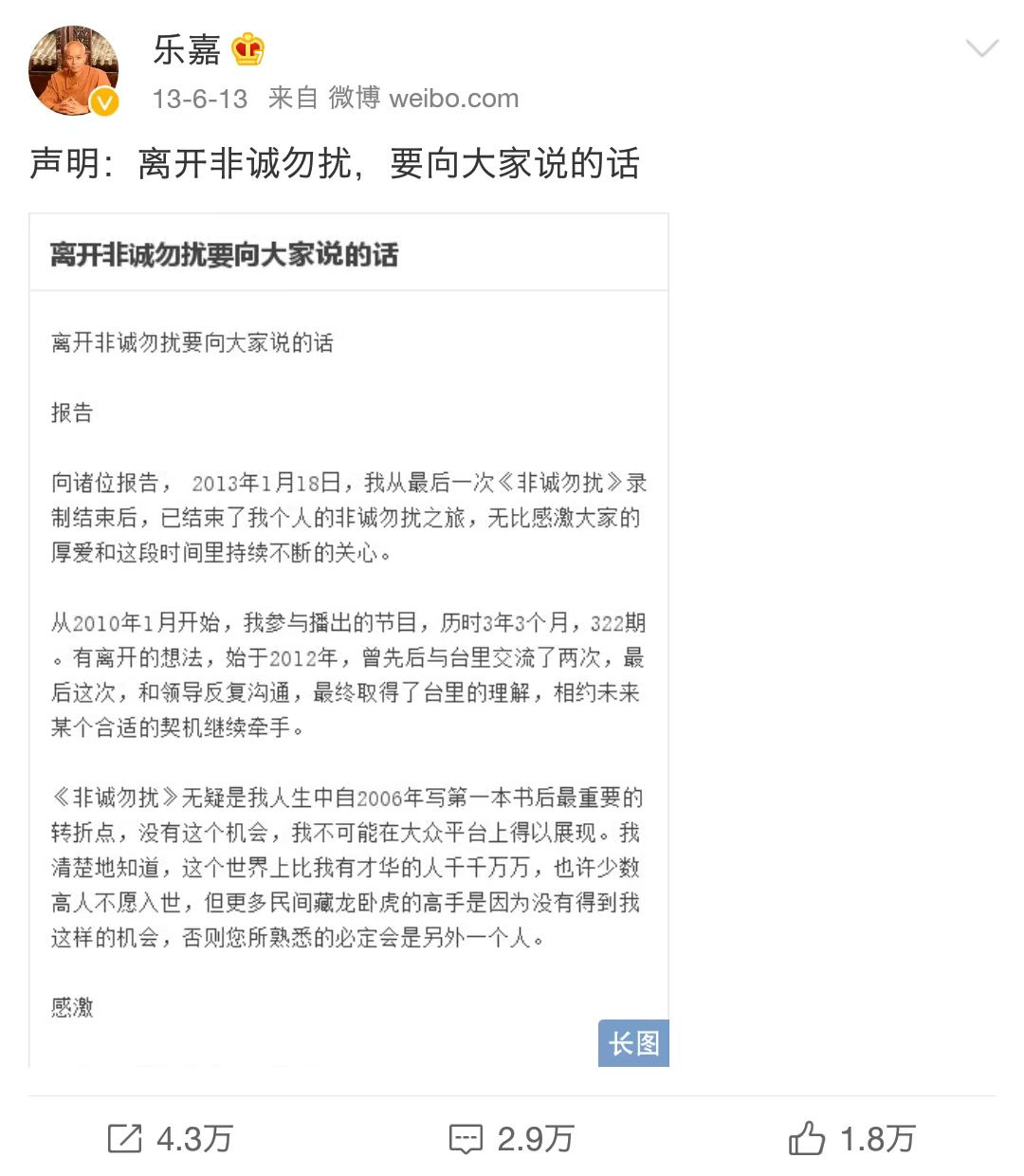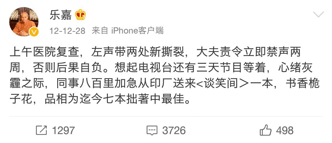 他先是發微博說自己聲帶受損,半年後直接在微博宣佈告別。