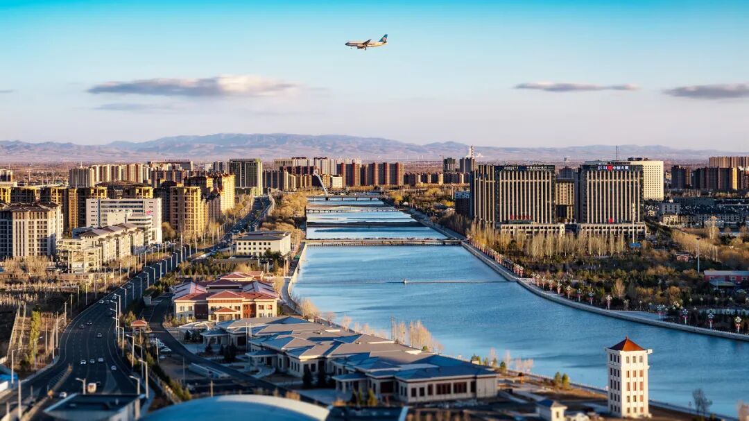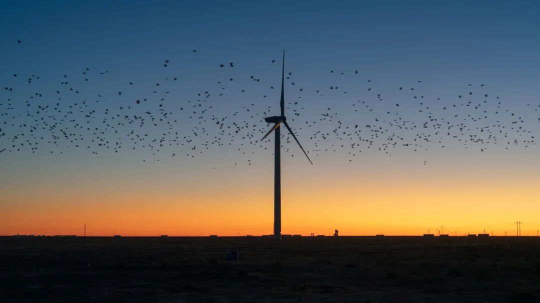 二連浩特風力發電機與大雁群日落。圖源:圖蟲創意
