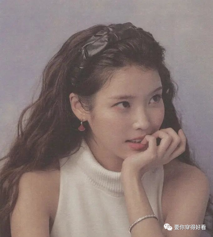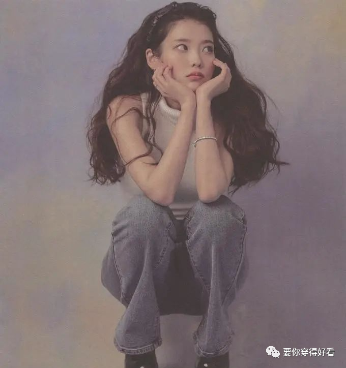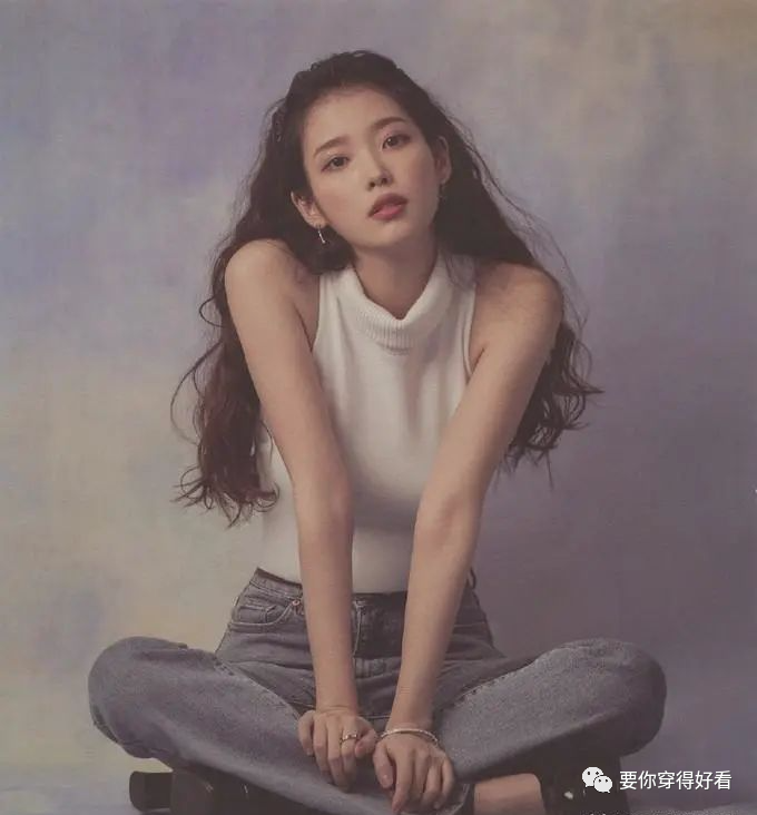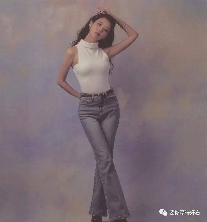 針織衫現在穿正是季節,像IU這款無袖背心款針織衫清涼性感,完美秀出了直角肩和玉臂,領口是螺旋式翻邊圓領,休閒不失溫暖。除此之外,針織背心整體設計特別修身,將IU玲瓏曼妙的身段凸顯出來了。下身是復古高腰牛仔褲,針織衫扎進褲腰,好比例瞬間分割出來了,直角肩配小蠻腰,IU這樣的身材穿背心特別好看。