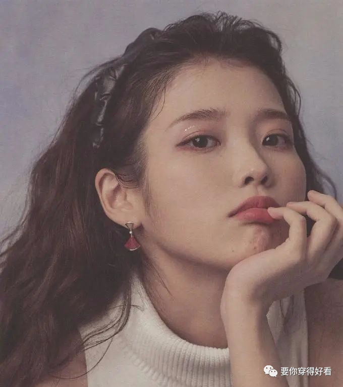 妝容走復古嫵媚風,復古紅眼妝和唇色,搭配西瓜紅耳飾,怎麼看都特別小巧可愛,嘟起嘴來賣萌。額頭前的劉海也做了小卷處理,向腦後梳,IU的髮際線也很優越,戴一款黑色皮質髮帶,固定住劉海,方便露出飽滿的額頭。黑色髮帶隱藏在髮間,不仔細看不容易發現,上一件是一件米白色無袖針織衫,小小的秀出了香肩。