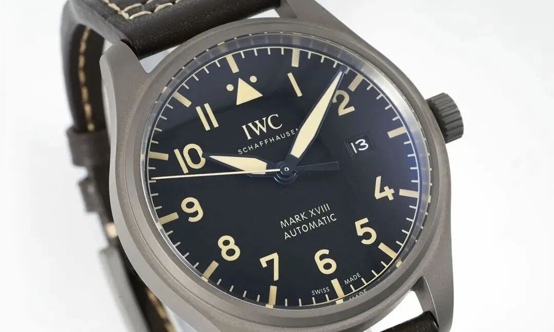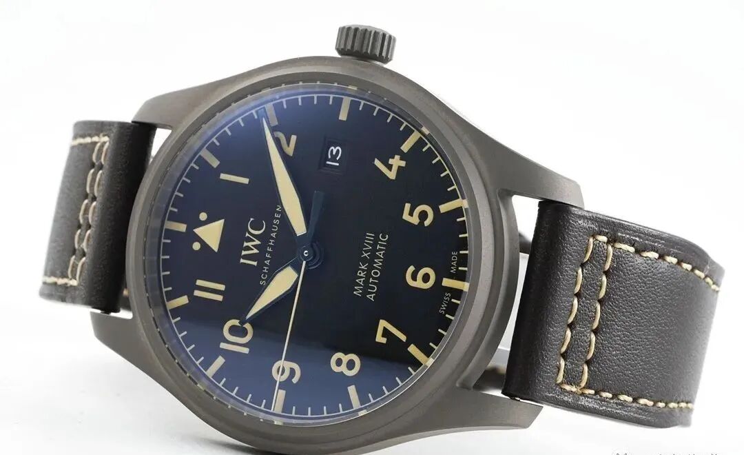 如果想要一塊休閒款腕錶,不如看看這款馬克18,這款腕錶錶殼直徑40毫米,整體設計借鑑了經典飛行員腕錶,一切以清晰度和可讀性為準則。因此我們可以看到錶盤上的阿拉伯數字時標非常大醒目,與此同時也有兩個例外——數字“12”被兩側帶有點狀標記的三角形標誌替代,“3點鐘”位置則為日期窗口。奶白色的指針上還特別添加了深藍色針邊,通過顏色的對比,讓指針看起來更加一目瞭然。此外黑色錶盤帶有夜光塗層,在暗處也可以清晰讀時。錶殼採用了鈦金屬,這種材質會讓腕錶整體非常輕盈,佩戴舒適度很高。腕錶搭載35111自動上鍊機芯,可提供42小時動力儲備。