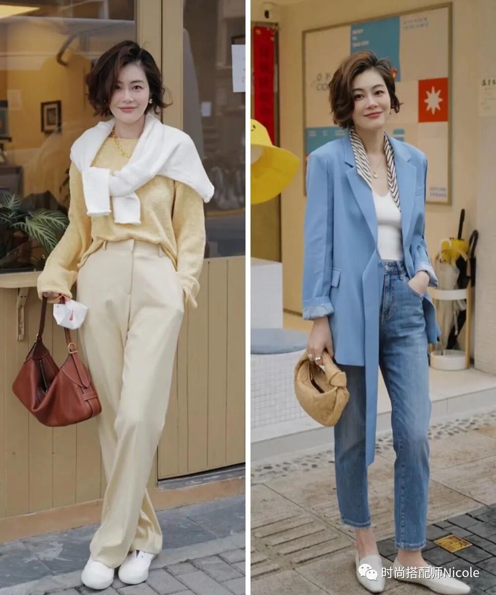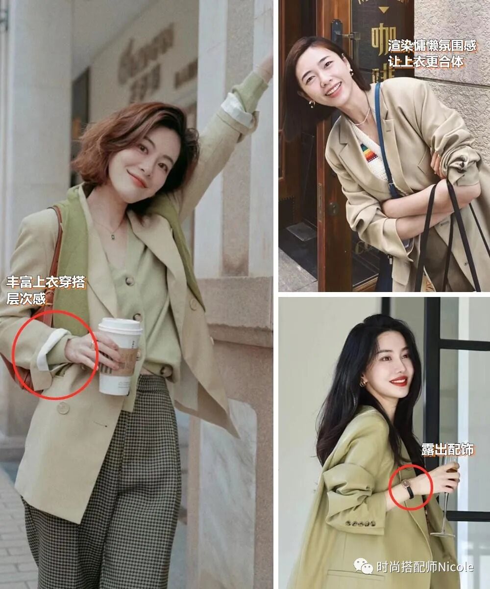 1、春天的時髦,就靠這三件外套 ① 休閒西裝春裝外套首選一定是一件休閒西裝,西裝的廓形感裁剪對於肩頸線條和氣質的修飾效果非常好,不但不挑身材,還能讓人穿上立馬變得精神起來。西裝領子建議選擇經典翻領,對方圓臉有修飾效果,疊穿也不會覺得臃腫。翻領越長對臉型越友好、越大氣,越短越文藝,日常選到肚臍左右的最佳。西裝的內搭選擇也很隨意,日常通勤可以選擇溫柔幹練的氣質襯衫、約會出遊可以選T恤、大領口打底。