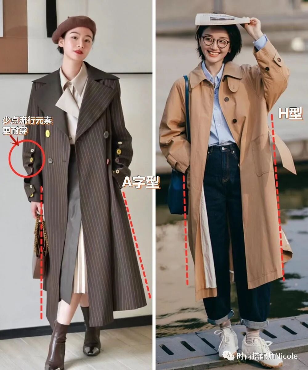 ③ 風衣 風衣是春裝裡的常青樹,也是一件可正式可休閒的萬能單品,買到一件品質好的風衣,完全穿10年都不會過時,尤其是卡其色的風衣,自帶優雅感,搭對了很給氣質加分。今年流行的h型風衣或a字型的風衣都是首選,顯瘦不顯臃腫,適合微胖女生。風衣的版型越經典越大氣,儘量避免盲目追一些“設計款”:拼接、拼色……,很容易過時不說,反而失去了風衣原本的高級感。