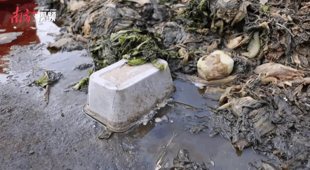菜葉發黑變爛,其中還混雜著菸頭、飯盒、塑料袋…..