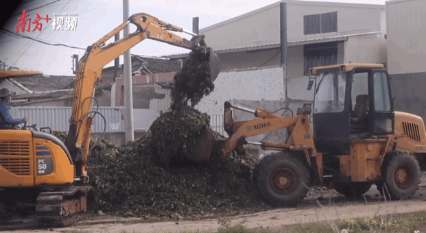 這些芥菜在外面曬乾水分後,會被挖掘機搬運到倉庫中。