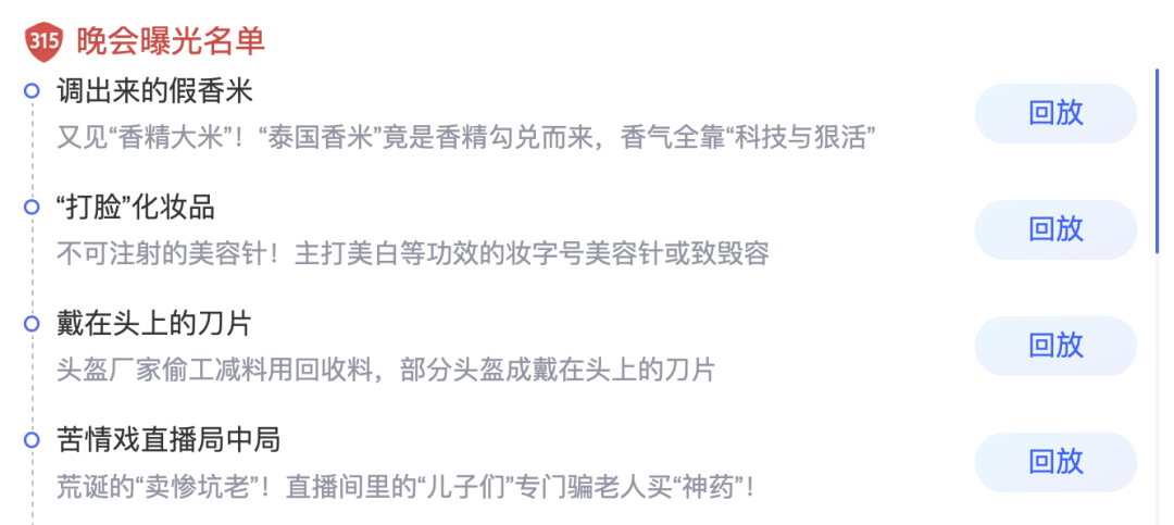 香精大米、毀容美容針、不安全頭盔、免費評書機騙局、直播間水軍、破解APP……