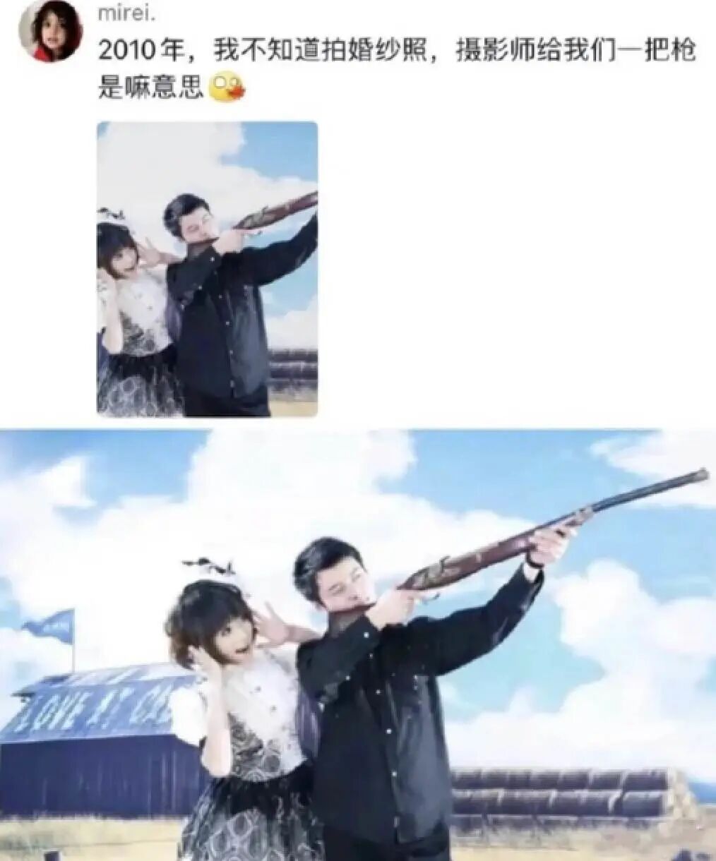 很難說清那把槍在畫面裡所表達的抽象含義,但這顯然不是個例,根據另一位網友分享出的婚紗照來看,這種拍法早就成為了一種流派。