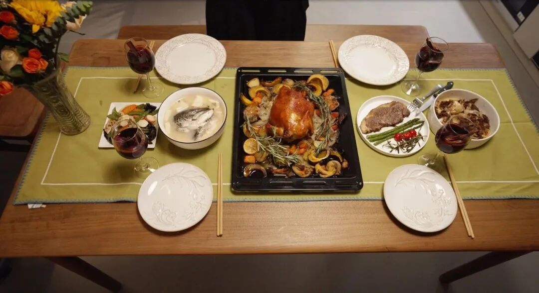 時間一到,提示音響起,香氣四溢、汁濃肉嫩的烤雞出爐,加上星廚燃氣灶烹飪的牛排、小炒和定時燉煮好的湯品,一桌色香味俱全的美味就齊了。