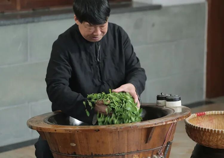 把剛炒完的茶葉再次放進石灰缸,俗稱收灰。等候7天,退火、收幹、提香、保鮮,才得圓滿。