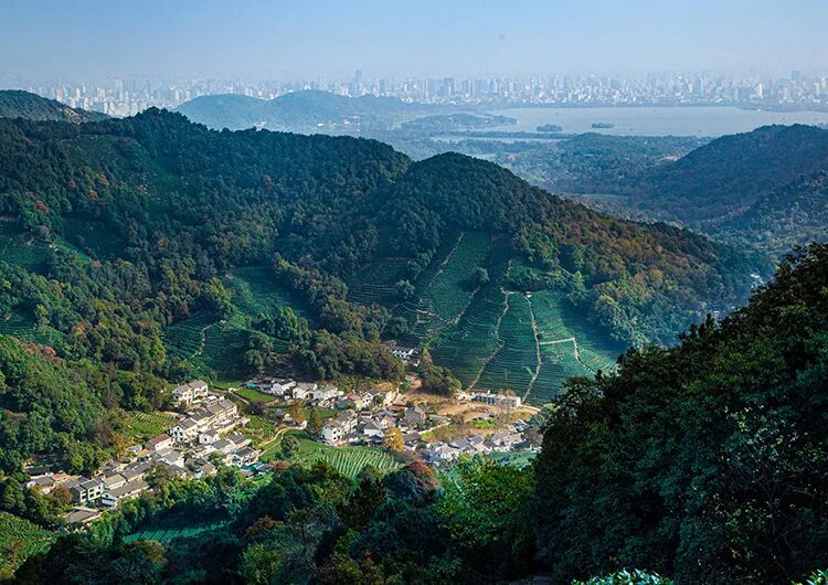 從獅峰山鳥瞰,遠處的湖泊是西湖,中間白色村落是龍井村,沿著龍井村一路向南,穿過蒼翠遍野與山路崎嶇,就到了翁家山上的翁家茶園。
