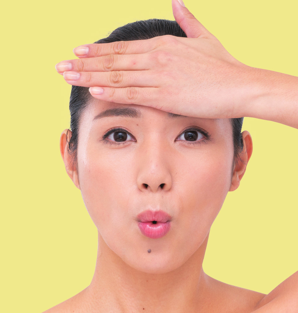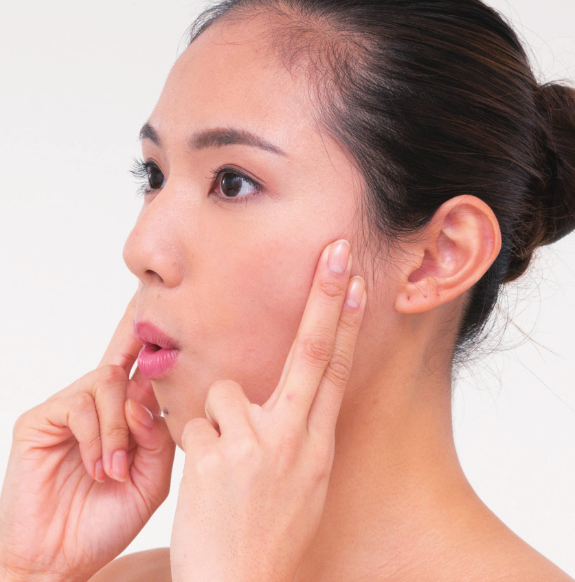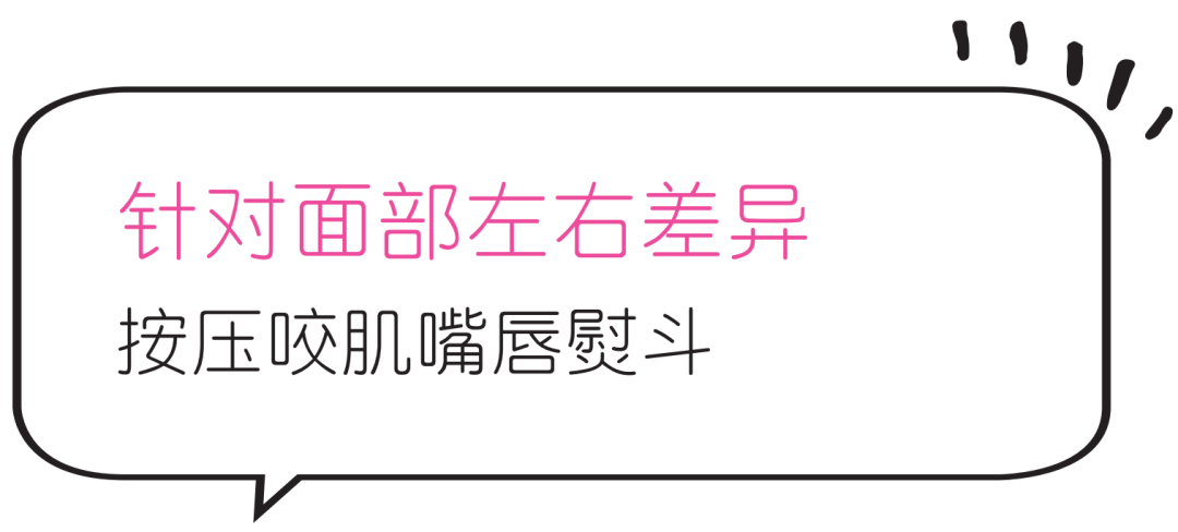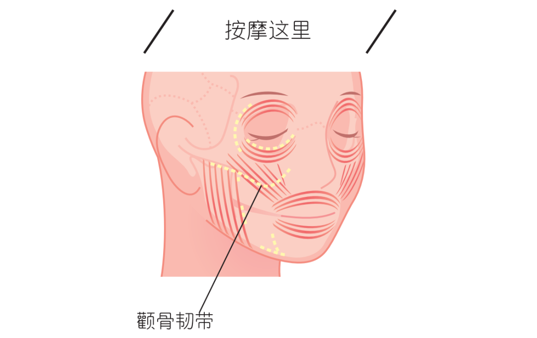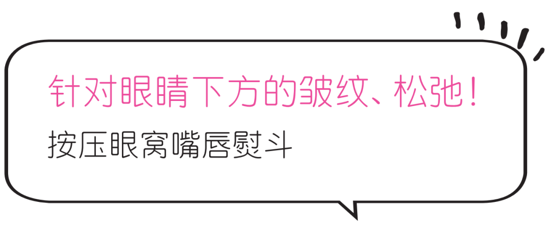 有效做法就是用手指按壓容易對法令紋產生影響的『眼窩下』、『顴骨』、『咬膠』韌帶,做出『HO』的口型,完成『嘴唇熨斗』動作。