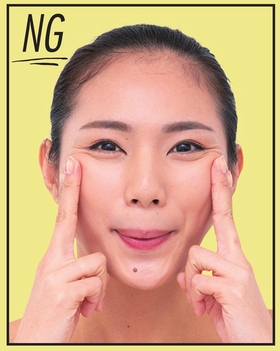 瞬間提起皮膚容易導致皺紋。用手指按壓時,要在肌肉上垂直施加較大力量,並且一直要有意識地做縱向運動。
