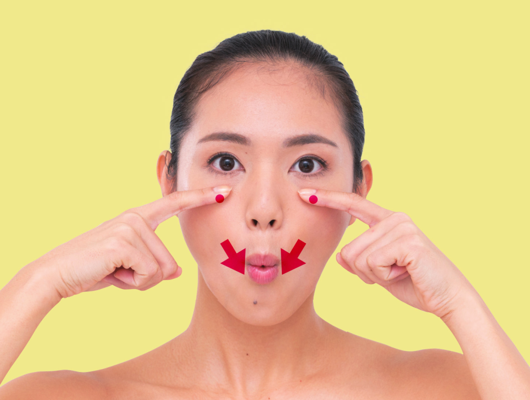 用手指側面按壓左右眼睛下方的骨骼部分,在此狀態下做出『HO嘴型,收緊。