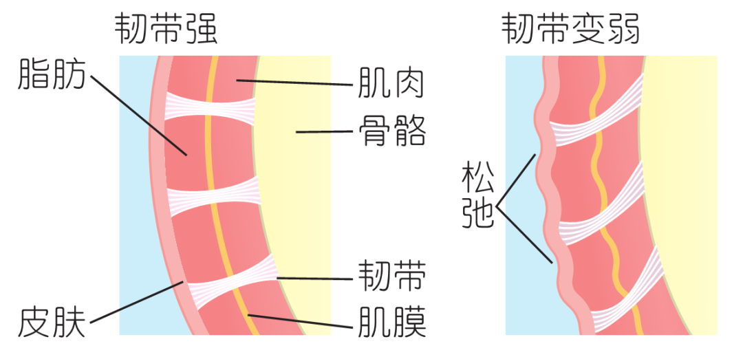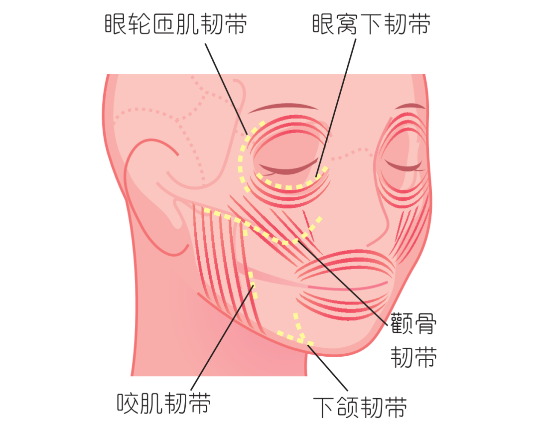 韌帶是細帶狀的纖維組織,隨著年齡增長會老化,從而使支撐皮下脂肪和皮膚的力量減弱。難以完全支撐和皮膚下垂,會引起皺紋和鬆弛。