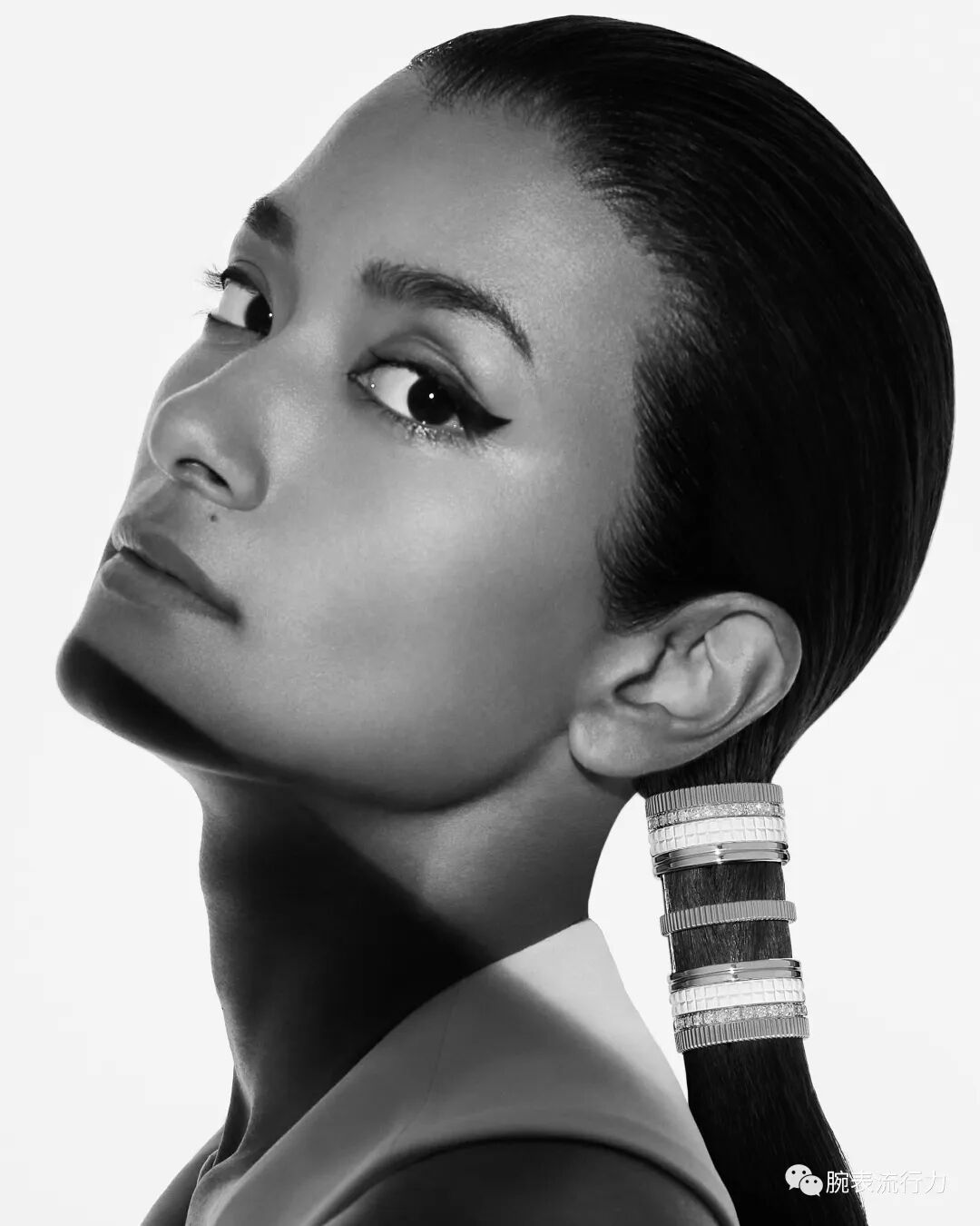 本季全新Quatre Double White系列大膽推出一件款式特別的髮飾作品。此款具有建築風格的作品於鏤空結構中引入羅緞直線刻紋、巴黎飾紋、雙圈同心圓及熠熠生輝的鑽石圈。只需一個簡單的步驟,即可賦予簡單馬尾造型華麗璀璨的優雅格調。