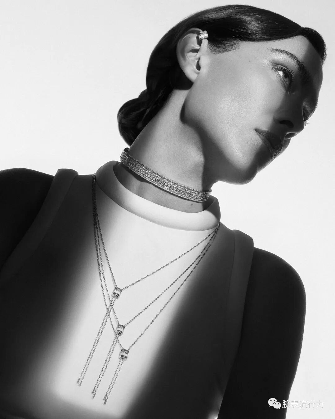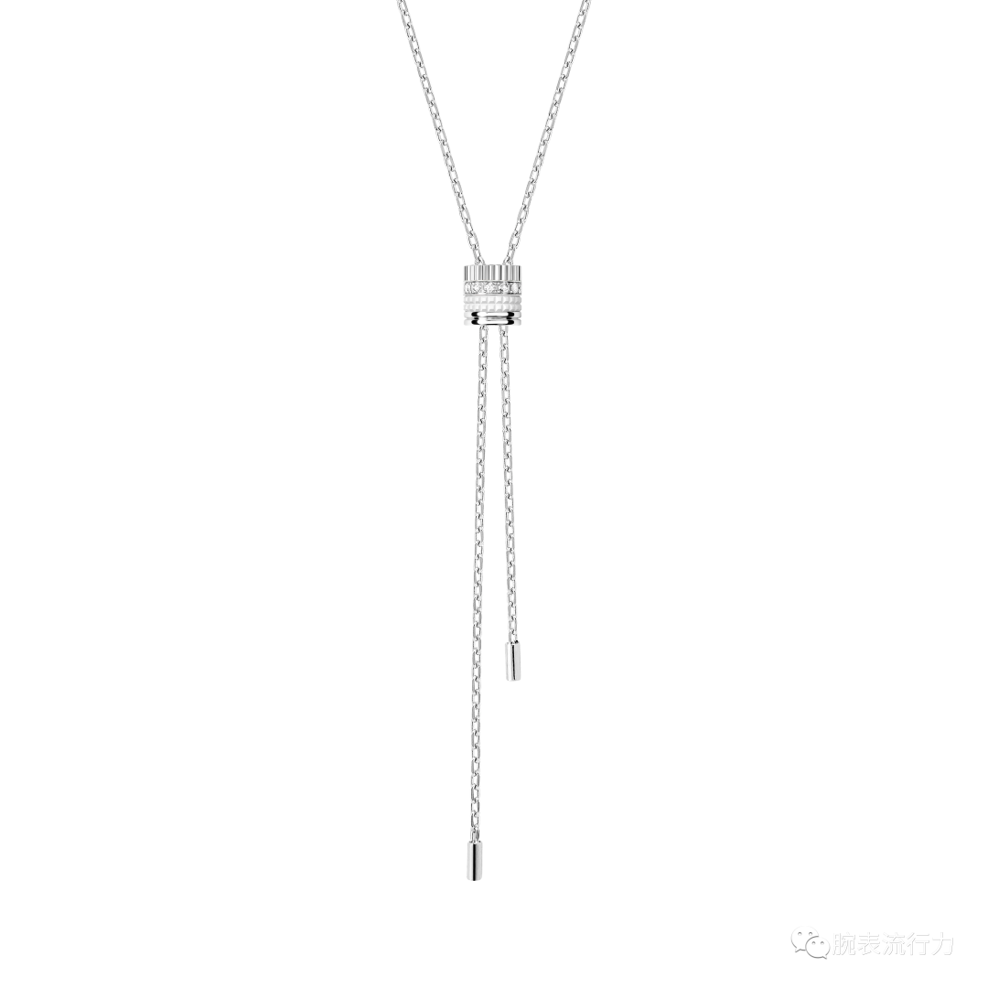 高精密陶瓷的純淨白色、白金材質打磨而成的細膩鏡面效果、鋪鑲鑽石折射形成的璀璨光芒……中央吊墜可於白金的鏈條上隨意滑動,不同材質間的強烈對比增強了項鍊的幾何線條層次感。此款全新長項鍊可根據佩戴者喜好於頸前自由調節吊墜位置,自由隨心,自在隨型。