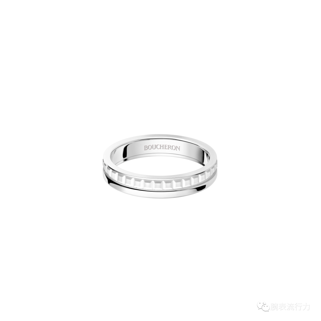 此款婚戒由白金及無瑕的高精密陶瓷圈組成。極具建築風格的巴黎飾紋完美融合細膩柔和的同心圓,白色陶瓷圈與白金材質的鏡面效果形成強烈反差。