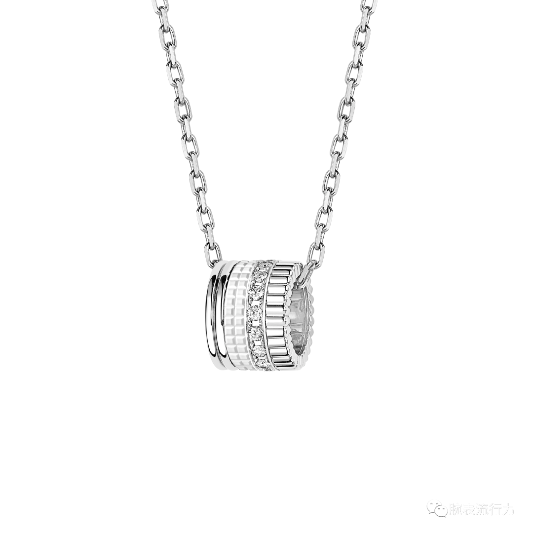 Quatre系列四大經典紋飾在這條集合白金、鑽石及高精密陶瓷的大型款吊墜上完整呈現。此款吊墜是全新色調、繁複細節和強烈材質對比的混合體,垂墜於白金鍊條之上,於胸口詮釋大膽創新的世家精神。
