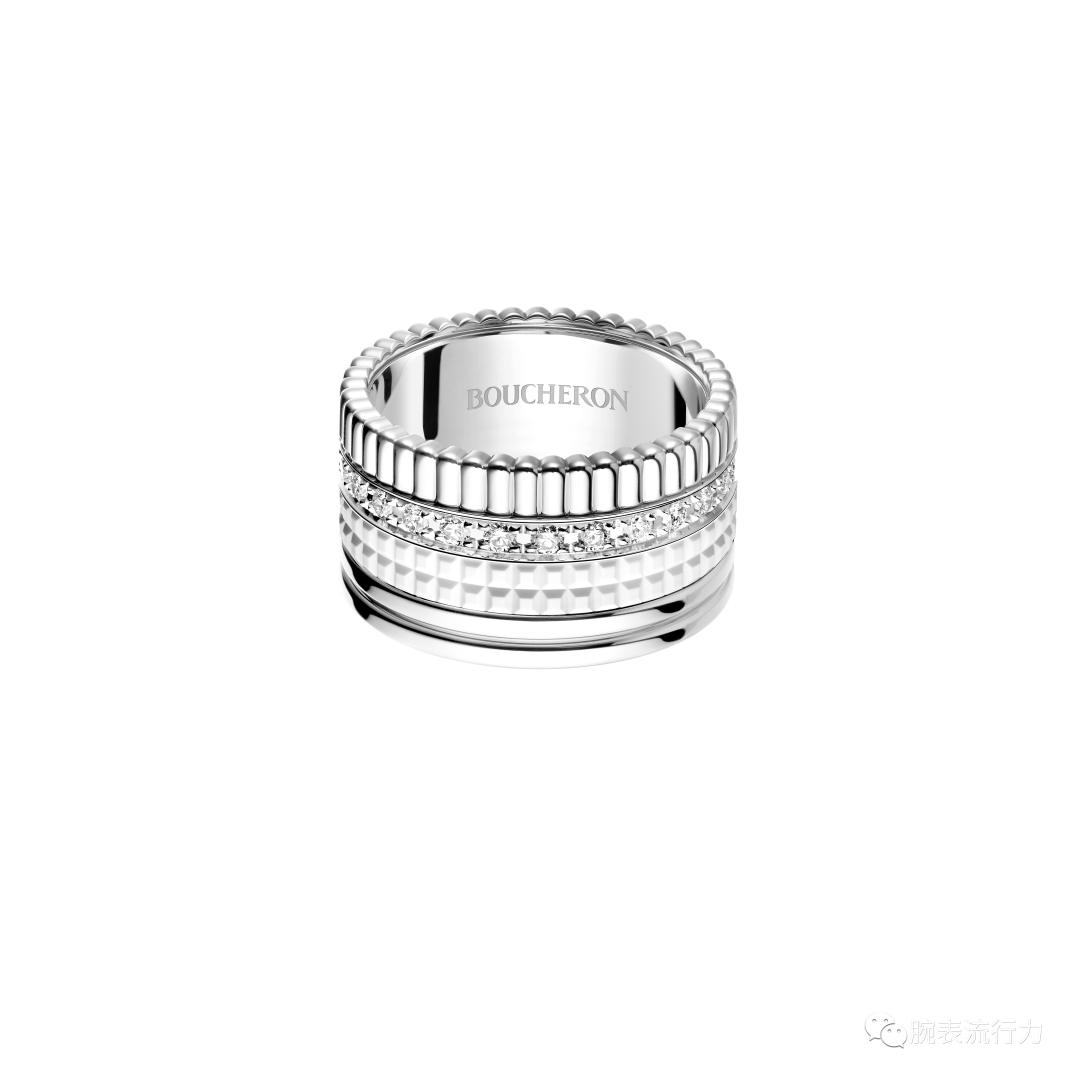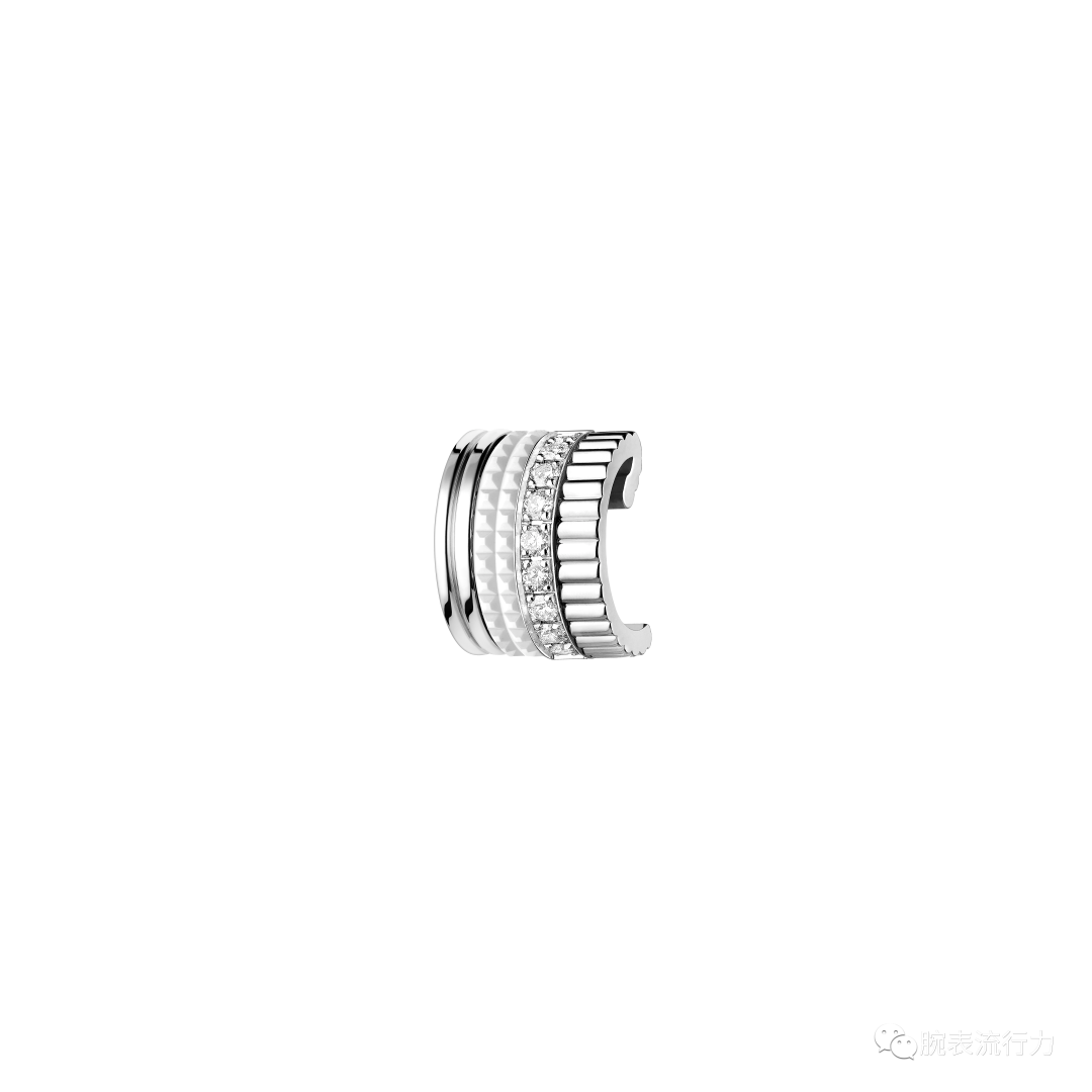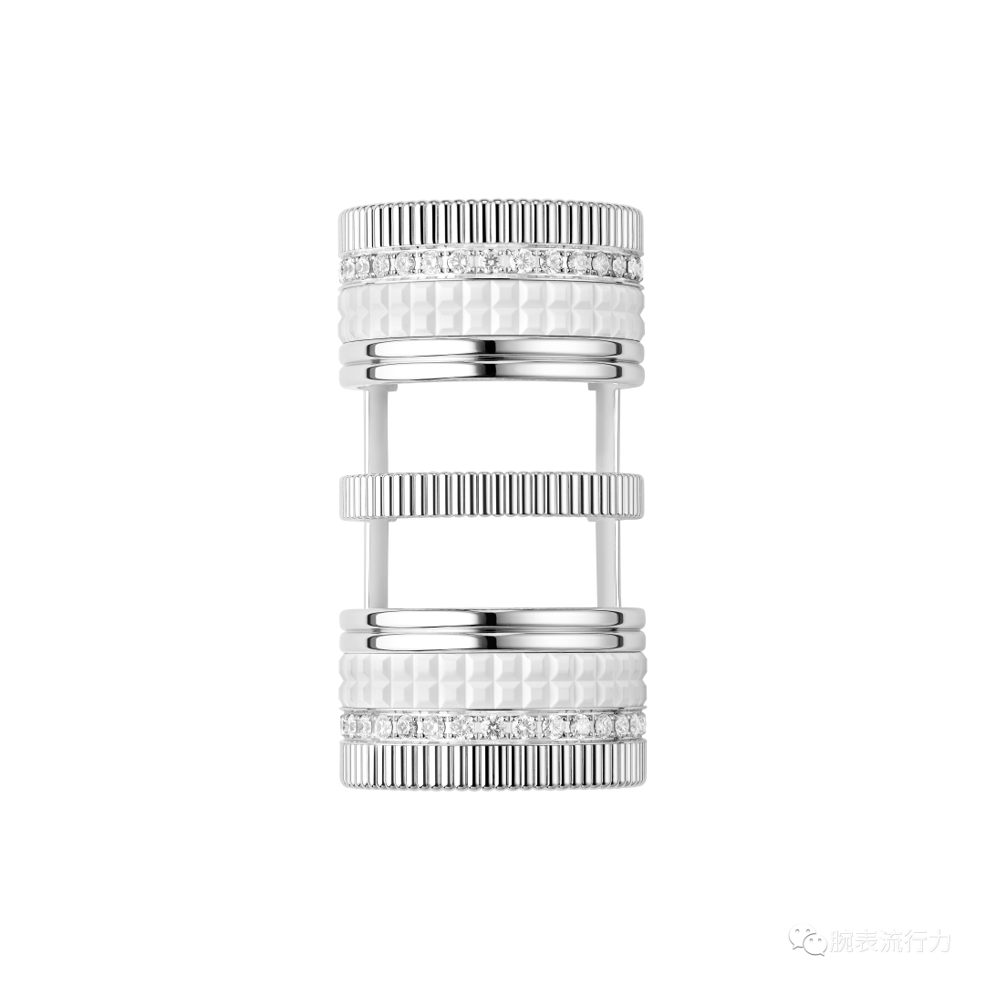 此款全新Quatre Double White系列戒指的單色設計,視覺衝擊強烈且極具張力。鋪滿鑽石的璀璨鑽石圈散發奪目光芒,與白色高精密陶瓷圈和兩條雕刻不同紋飾的白金圈相互呼應,展現全新系列的設計法則。