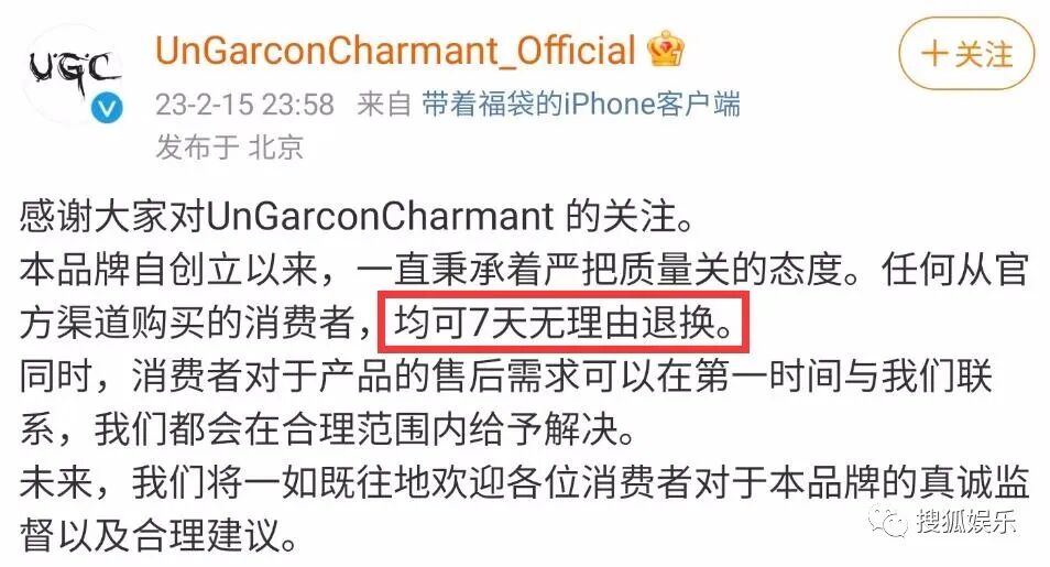 當日晚間,UGC官博發佈聲明,表示可以解決消費者的售後需求,從官方渠道購買的可以7天無理由退換貨。