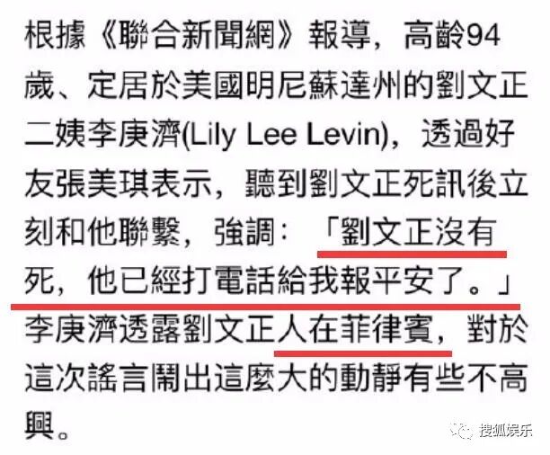 事發後,劉文正高齡94歲的二姨通過好友闢謠稱,“劉文正沒有死,他已經打電話給我報平安了。”