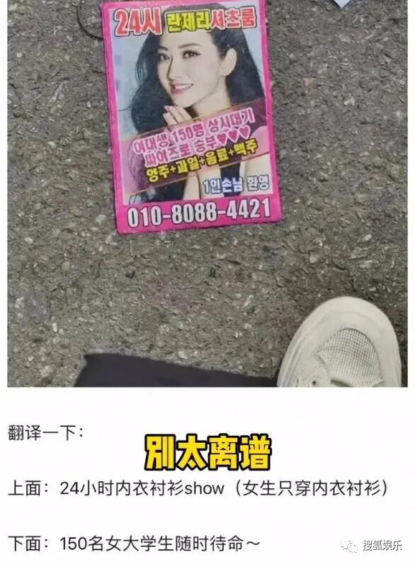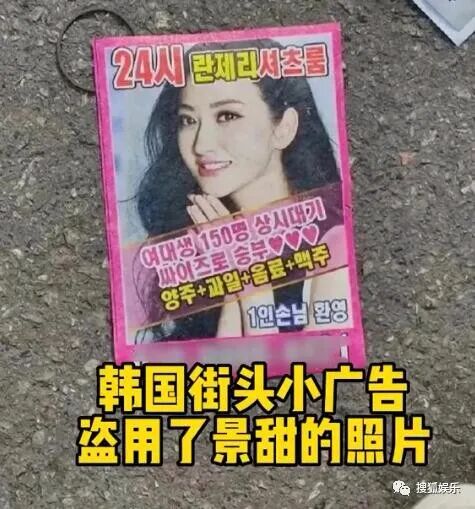 16日,網友曬圖稱韓國街頭擦邊球小廣告上面赫然印著的,竟然是景甜的頭像。