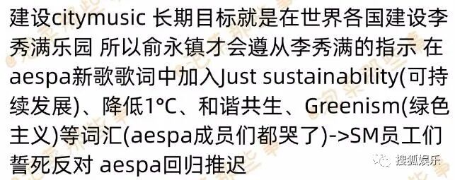 李秀滿對藝人事務干預過多,aespa組合原定於今年的2月20日迴歸,但李秀滿本人沉迷於綠色環保,要走一個可持續的概念,強迫製作人在歌詞中加入“植樹”一類的歌詞。SM員工對此不滿,歌曲取消發行,aespa組合的迴歸計劃也因此推遲了。