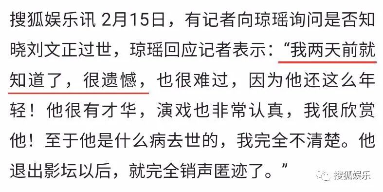 有記者向瓊瑤詢問是否知曉劉文正過世,瓊瑤回應:“我兩天前就知道了,很遺憾,也很難過,因為他還這麼年輕!”