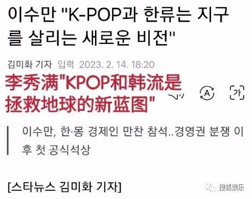 歪樓說下李秀滿“愛植樹”的這個標籤,2月14日下午,李秀滿出席活動演講時表示,將通過K-POP和韓流,走上人本主義和可持續發展的道路,從而拯救地球。
