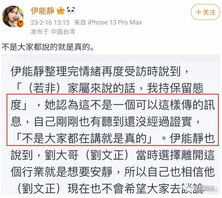 伊能靜曬出新聞截圖並配文,稱自己在採訪的後半段說了 " 不是大家都說的就是真的",她當時還沒有證實消息的真實性。