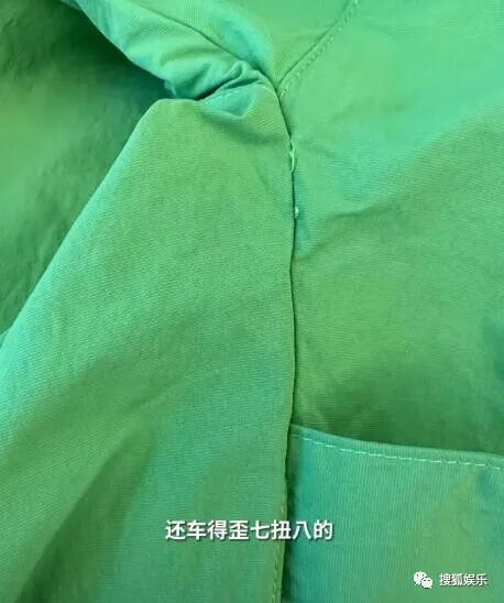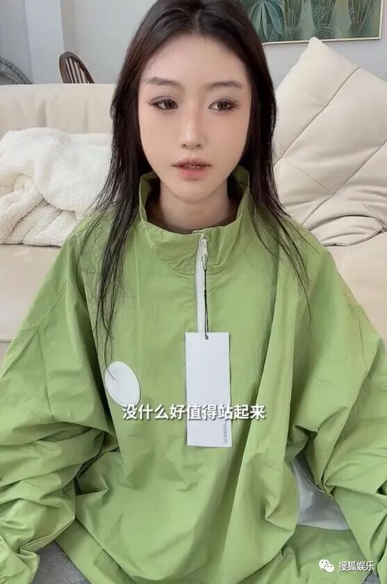 視頻中,博主穿上了這件綠色外套,面無表情坐在地上,稱這件衣服毫無設計感,根本不值得她站起來。