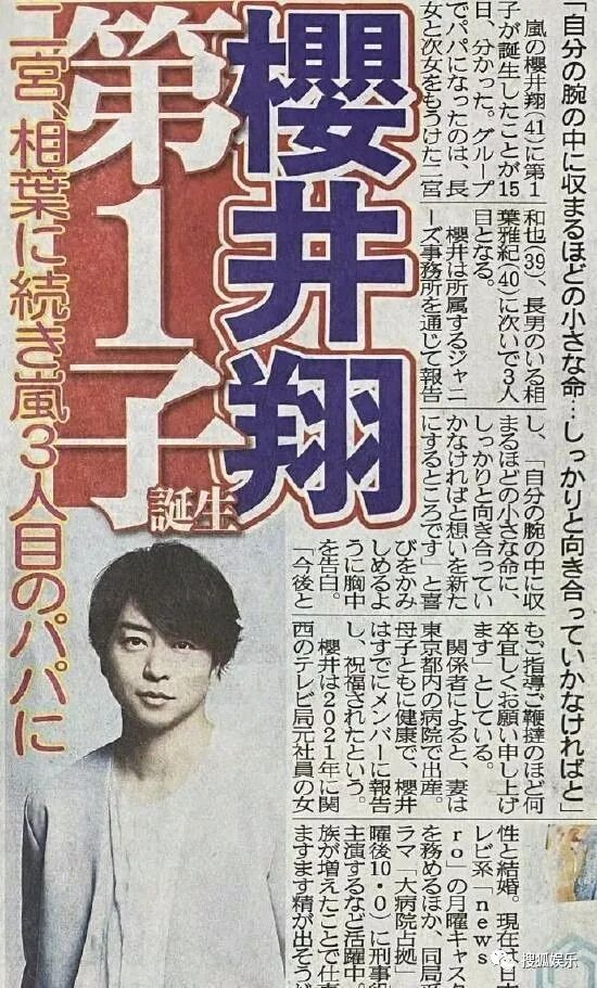 繼二宮和也、相葉雅紀之後,櫻井翔成為嵐組合中第三位做爸爸的成員。